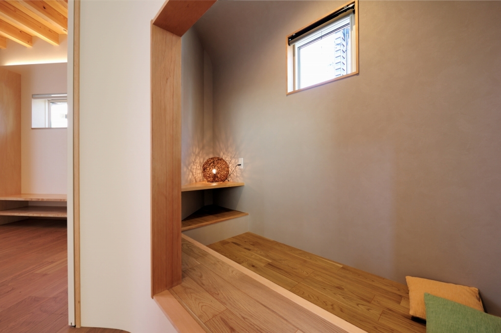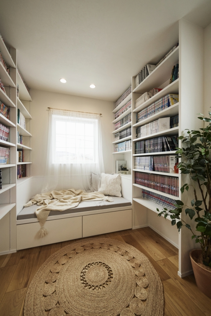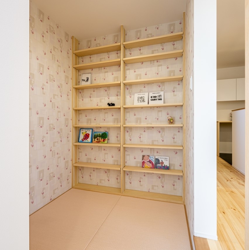 小さな本棚と小上がり収納を設け、1帖ほどのスペースとは思えない充実の隠れ家に。