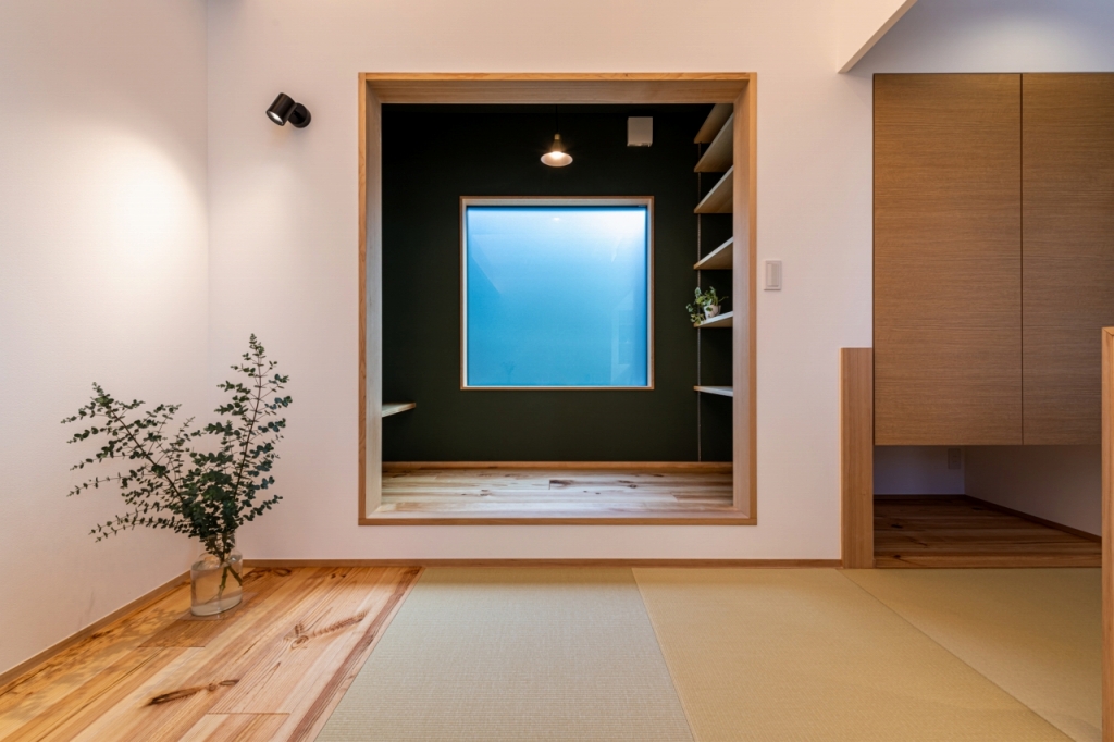 LDKの一角にタタミ2帖+本棚を設け、ゴロゴロできる日本ならではのヌックに。