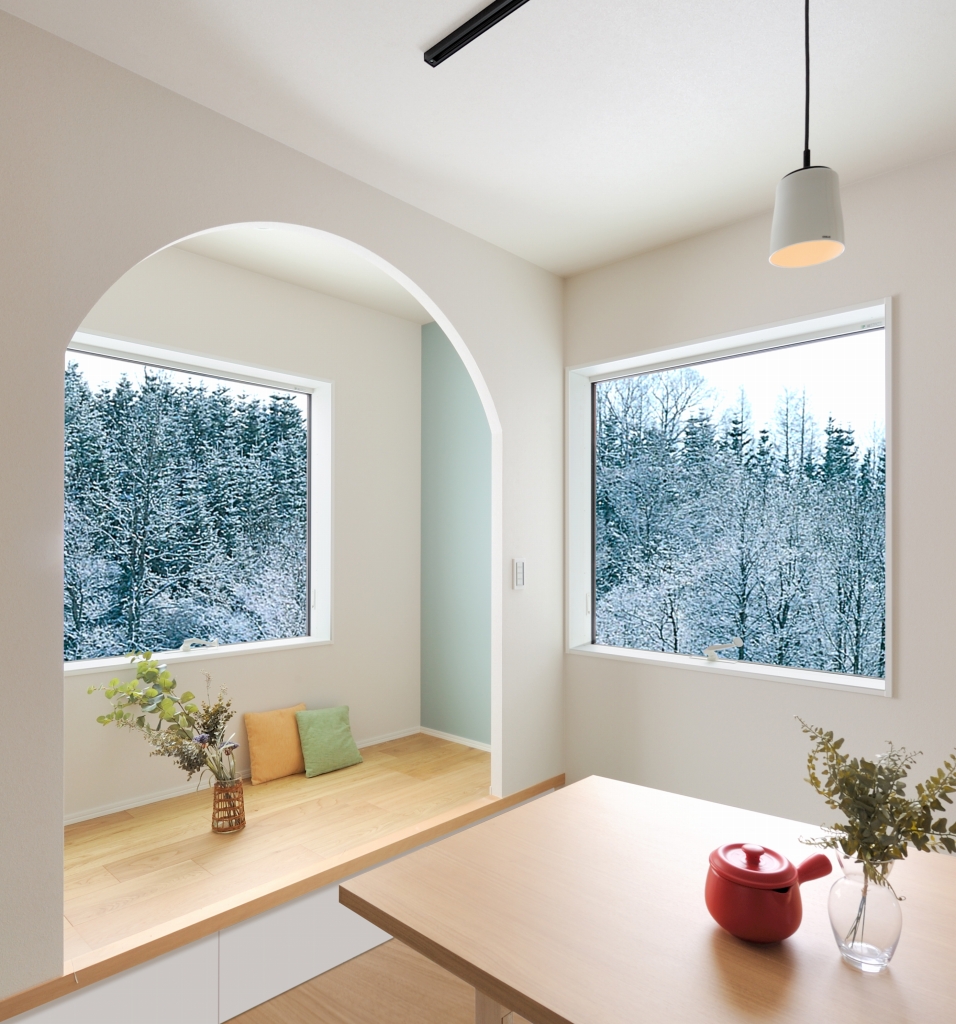 ダイニング横のヌックは、R型の下がり壁を設けることで、その一角だけ、優しく包み込まれるような特別な空間になりました。