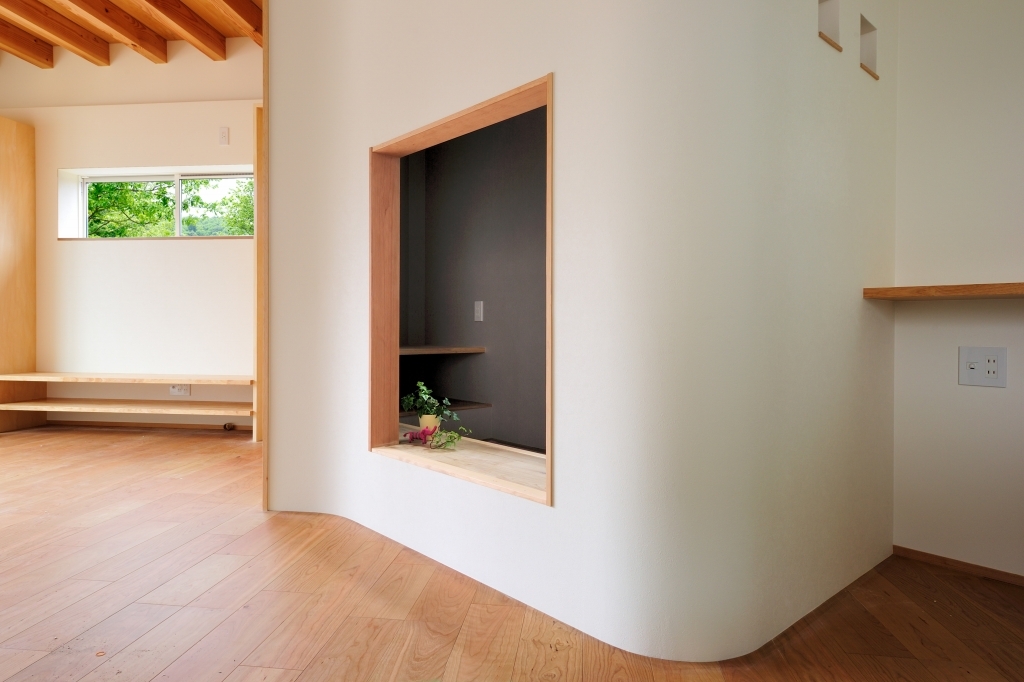 やわらかな曲面のかたちに導かれ、大きな開口をまたいで中に入ると、すっぽりと包まれるような心地よさが待っています。