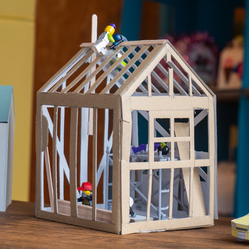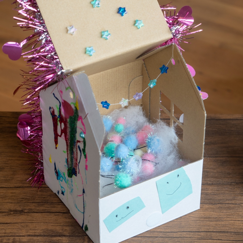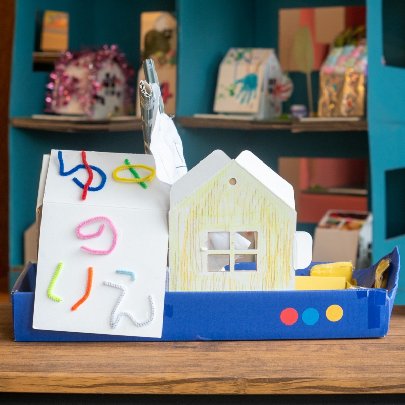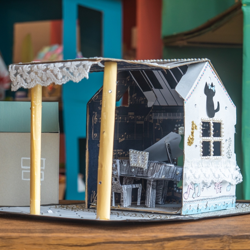 工夫したところは「ピアノのおうち」の文字をつまようじで1つ1つのりでくっつけたところや、音ぷをダンボールでしたところや屋根などです。