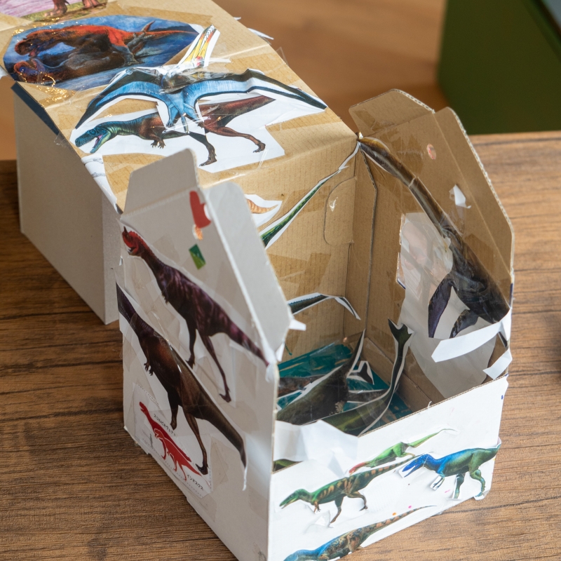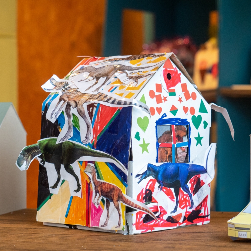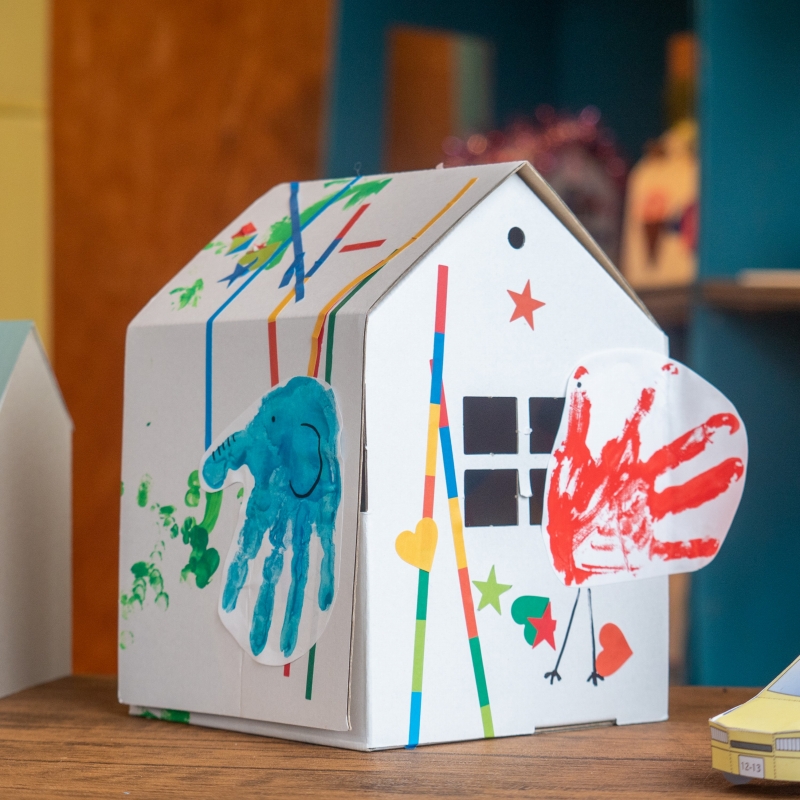 動物が好きなので、いつでも動物とふれあえるおうちを作りました。普段あそんでいるシール貼りや指スタンプ等で楽しみながら作品づくりができました。