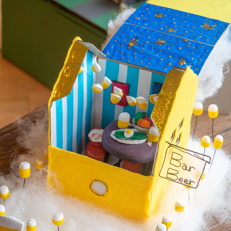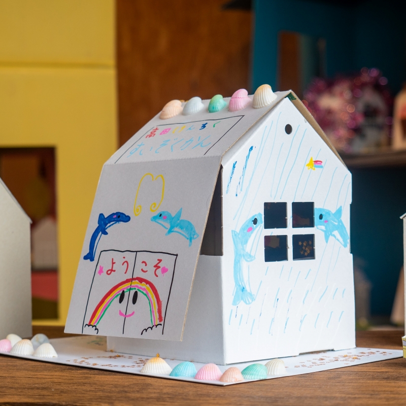 ラメなどで海のしぶきをイメージしました。家の中には、すいぞくかんのあんないずを入れた。