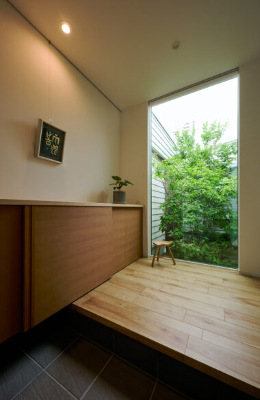玄関ホール、LDK、寝室が中庭をコの字型に囲む間取りは、いつ、どこにいても緑がそばにある。
