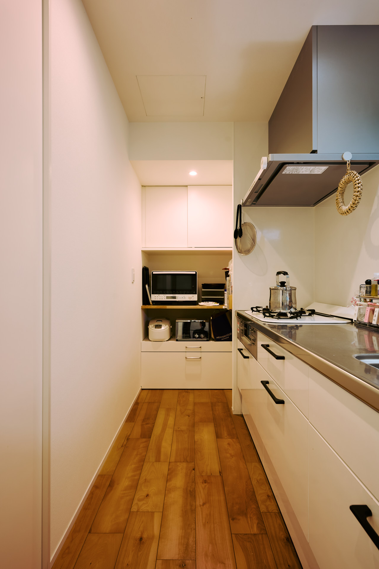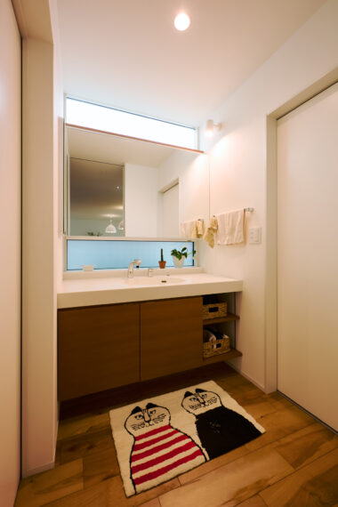 ただし壁一面に伸ばしつつも高さを抑え、対面キッチンの壁もあえて吊り棚を設けないなど、余白が大事にされている。
