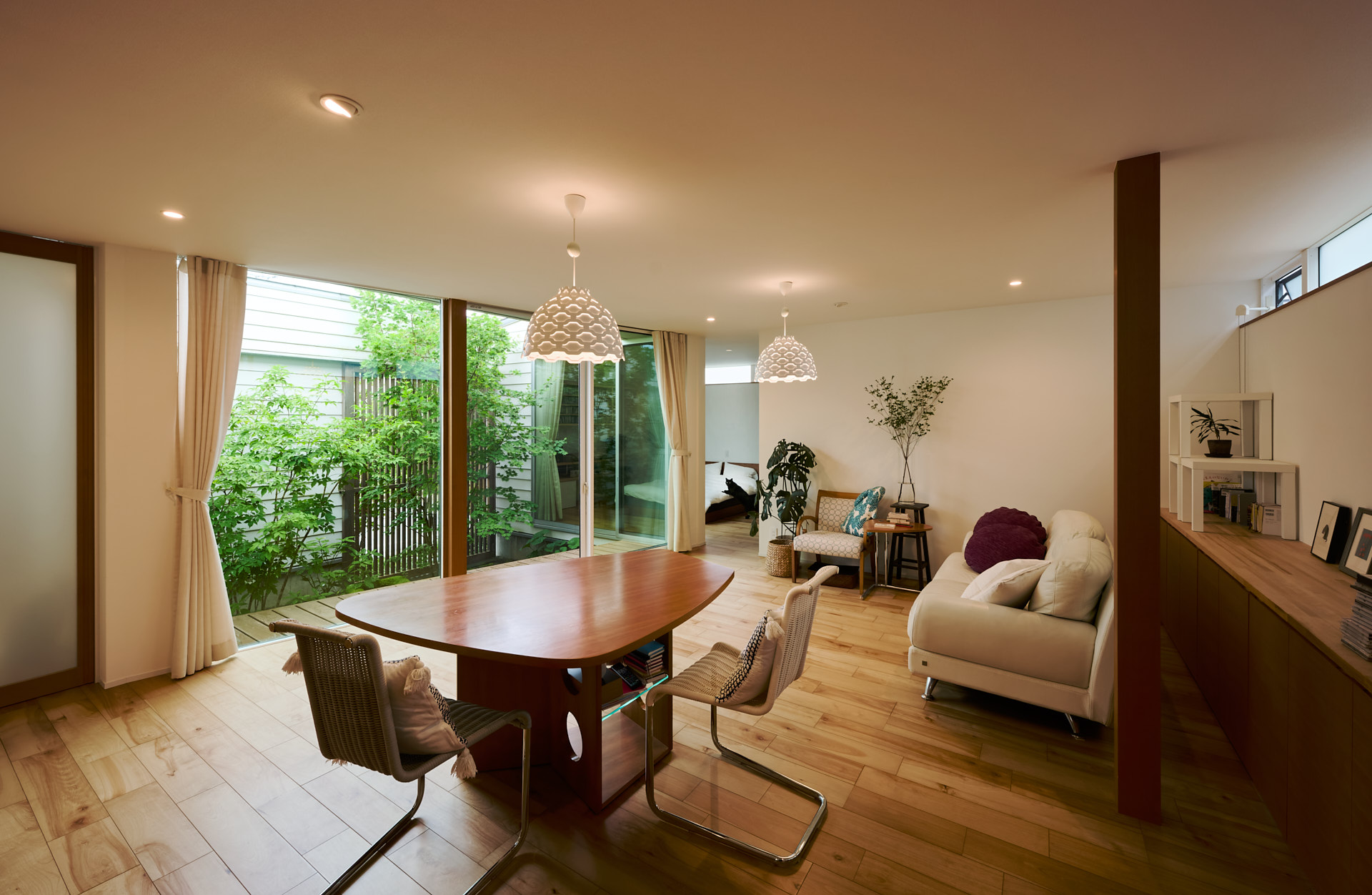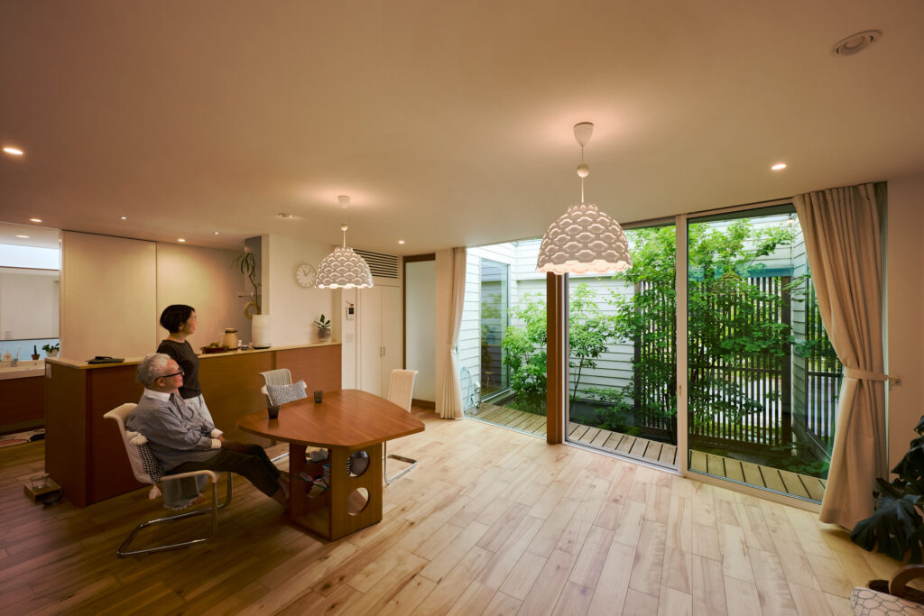 二人がもっとも多くの時間を過ごすLDKは、大きな窓で中庭に面している。