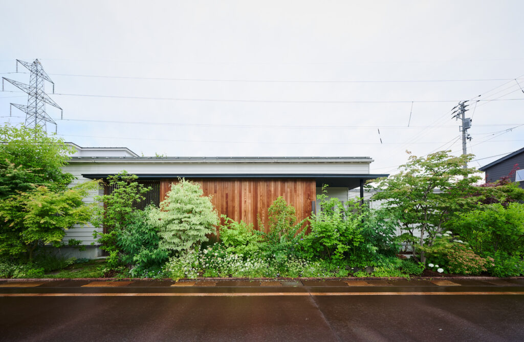 木々や草花が折々の表情を見せ、白や木の外壁に映えている。黒い庇(ひさし)によって水平が際立つ