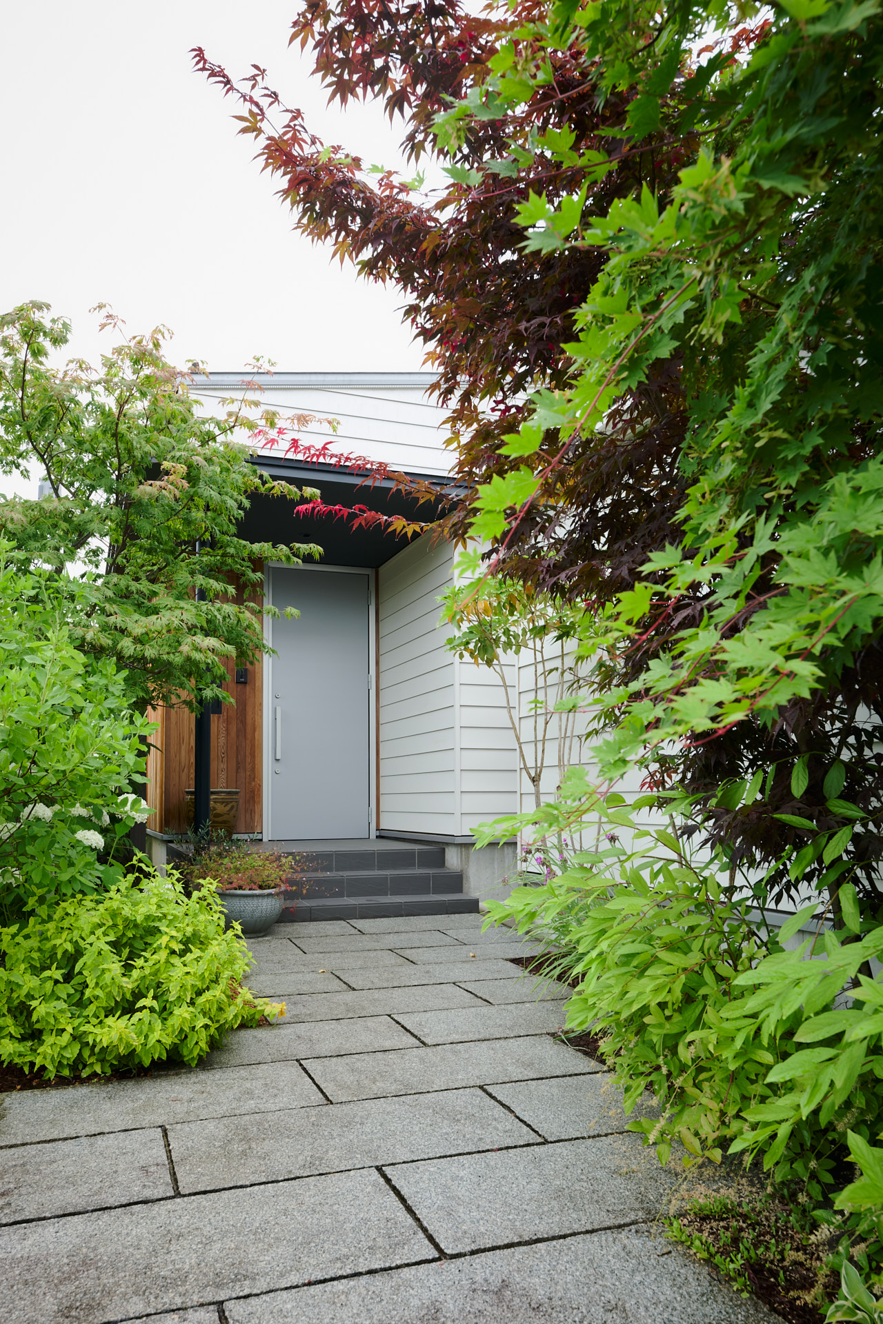 屋根は低めで、緑の中に楚々とある。アプローチに回ると、木々の間に見え隠れして玄関が見えた。