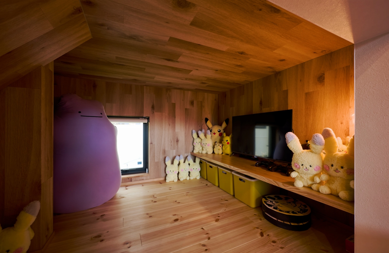 住まいには、夫婦それぞれの趣味の空間が備えられている。奥さまのコレクション兼ゲームルームにはキャラクターのぬいぐるみがいっぱい。「好きなものに囲まれて籠る感じがいいし、ここに入る分だけにしようという目安にもなっている」と話す。