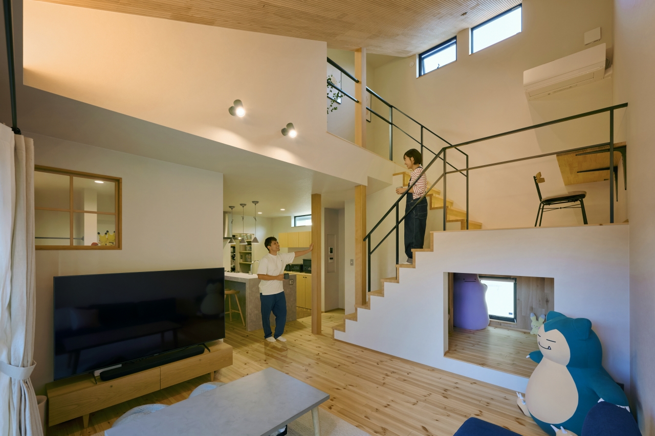 二人は見学会で「美術館の家」を訪れ、素材の持つ質感に引かれたという。「無垢の木の床や塗り壁っていいなと思って、*放題紙にも書きました」。床や天井には無垢の木、手すりは以前から憧れていたというアイアンに。さらに「大好きなキャラクターを置く部屋が欲しい」という奥さまの要望に応えて、階段下にコレクションルームが設けられた。ホワイトファーを張った勾配天井の下、中2階に書斎スペースのあるスキップフロアは、趣味と暮らしがほどよく区切られつつも両立、楽しさに満ちている。