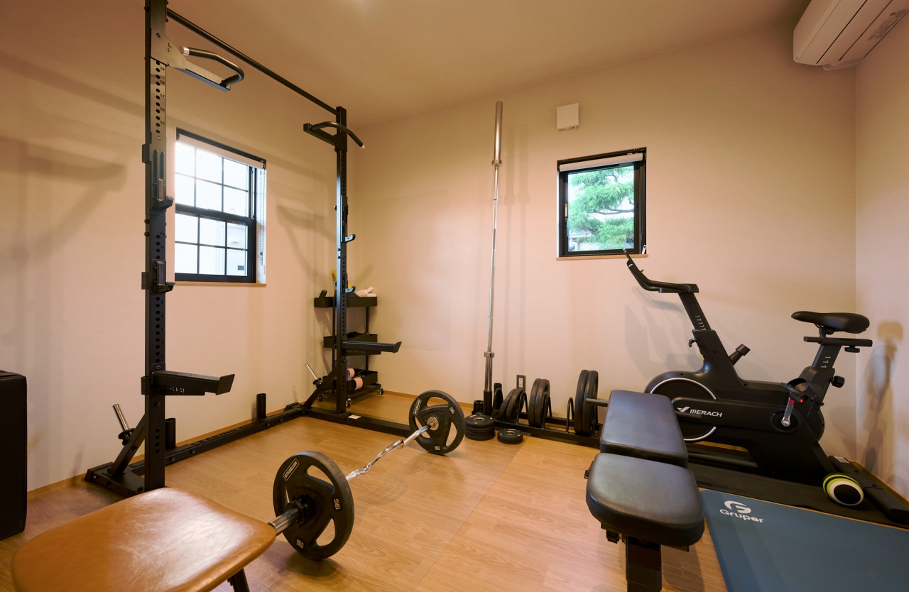 一方「筋トレが趣味」というご主人は、キッチン奥のトレーニングルームが自分の部屋。身体の調整を伝える仕事柄「自ら実践して、根拠のある整え方を伝えたい」と時間を作ってはトレーニングに励んでいる。好きな世界に浸りつつゲームをしたり、身体を鍛えたり。二人はそれぞれの空間で、自分時間をアクティブに過ごしている。
