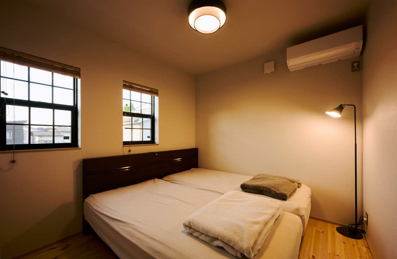 2階にある寝室は、一転して落ち着いた雰囲気。壁は「無垢の床やアイアンに馴染むように」と選ばれたグレージュ。ニュアンスのあるこの中間色は、1階の壁や建具にも採用され、家全体のベースカラーとなって素材を引き立てている。「どんな色にするか悩みましたが、この色にして本当に良かった」。暮らす中で、満足が高まっているポイントだという。