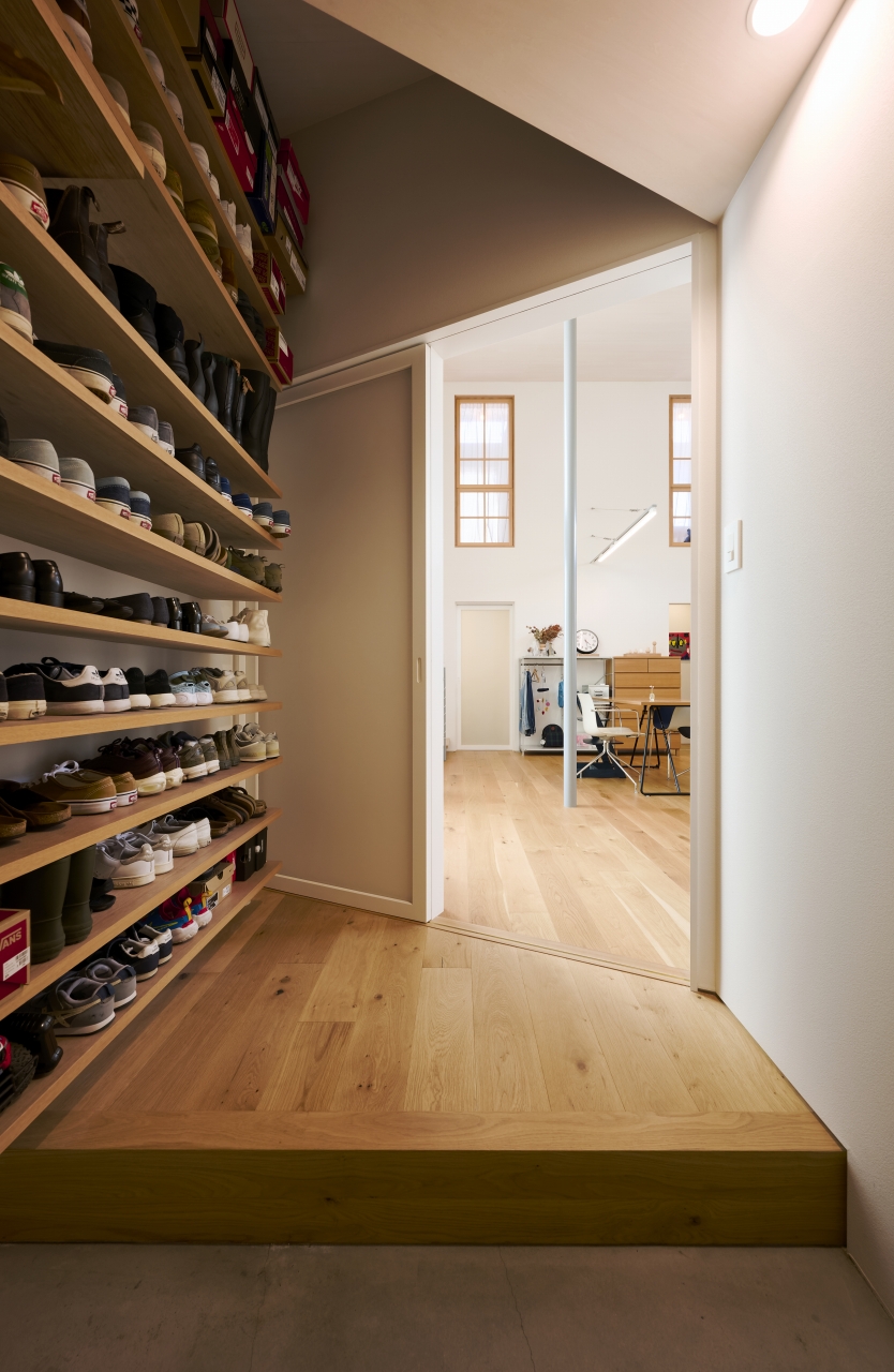 坂道の途中に片流れの屋根の箱。印象的な外観を見つつ室内に入ると、傾斜を生かした間取りに、いくつかの「斜め」が配されていた。