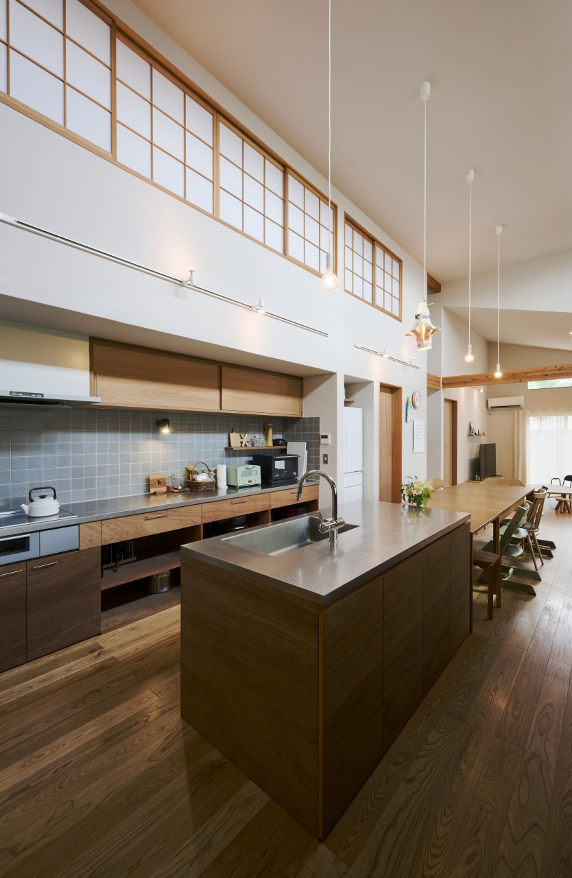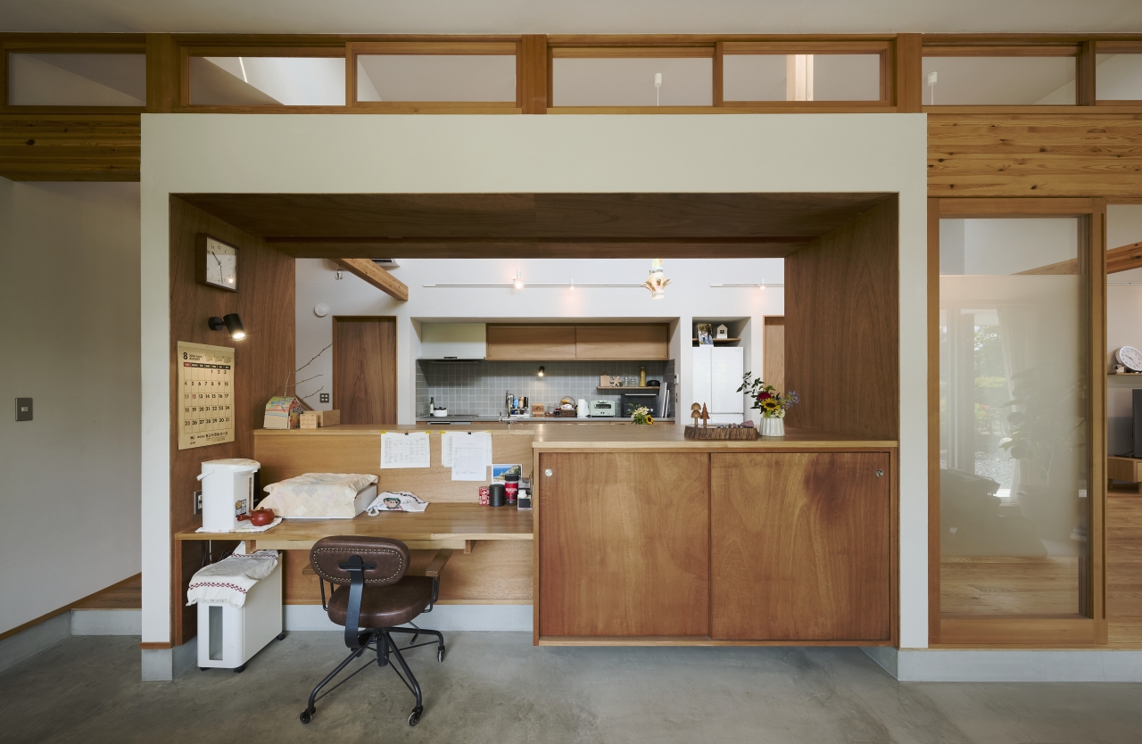 N家のご主人が「どこからでも子どもが見えるような壁のない暮らしがいい」と、つながる暮らしに前向きだったことから、キッチンも水回りも玄関も一つというほぼワンフロアの間取りに落ち着いたという。