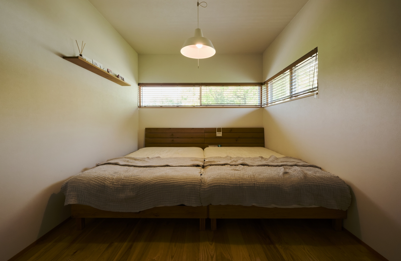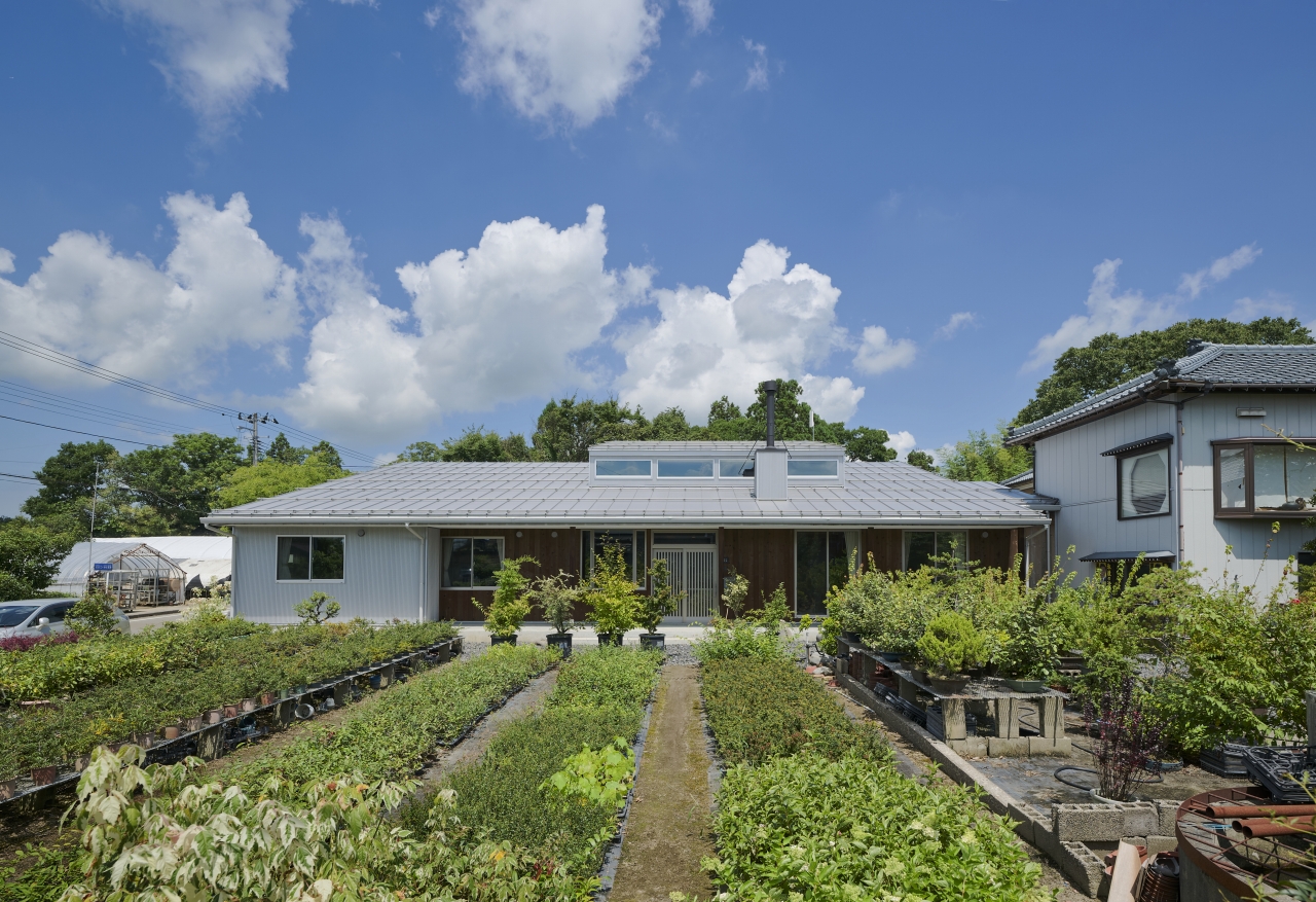花き園芸の産地として知られる閑静な一角。周囲の風景に溶け込むように低く、圃場の緑と溶け合う家がある。