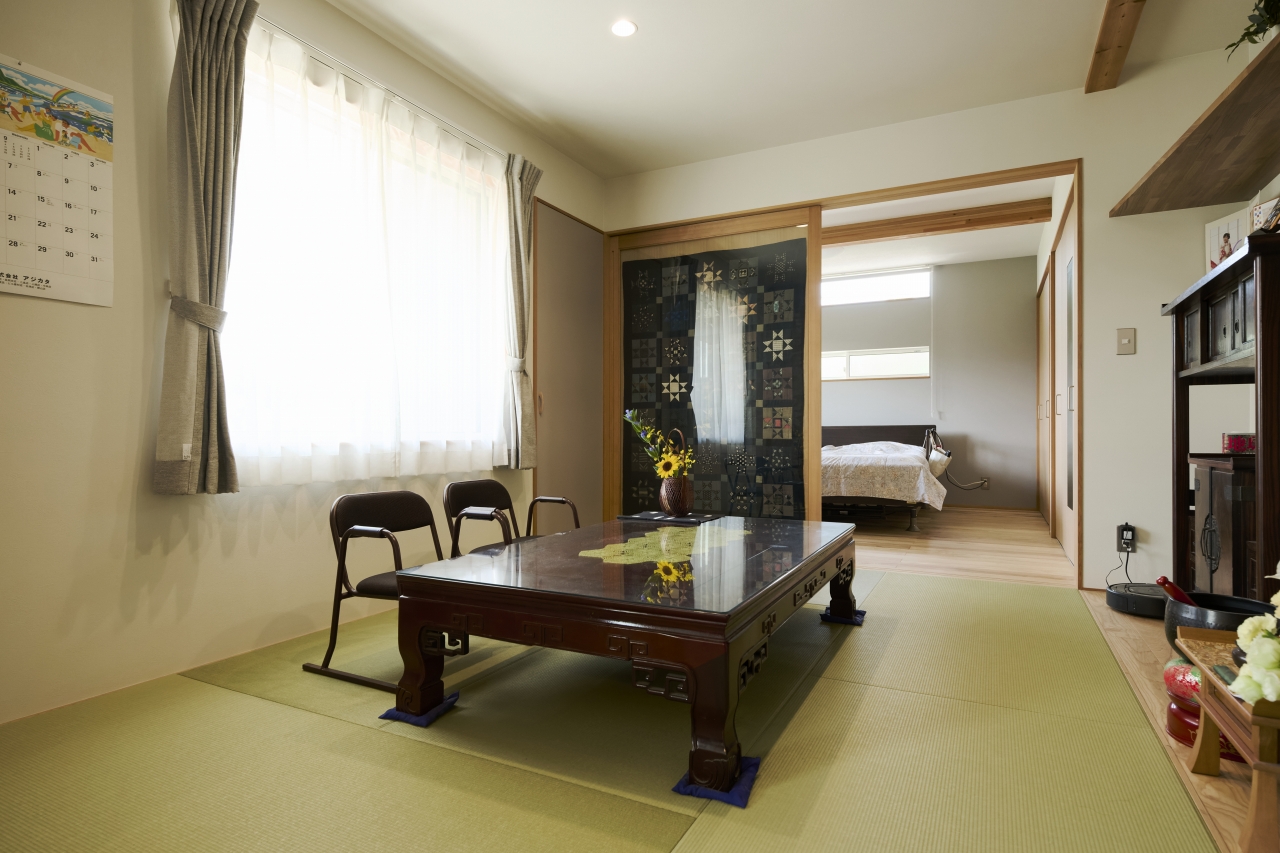 訪れた人がちょっとお茶を飲んだりおしゃべりしたり、圃場の手伝いに来ているお母さんたちがお昼を食べたり。さらに隣り合った和室は、ご両親の居間であり、お手伝いに来ている地元のお母さんたちの休憩場所にもなると言う。