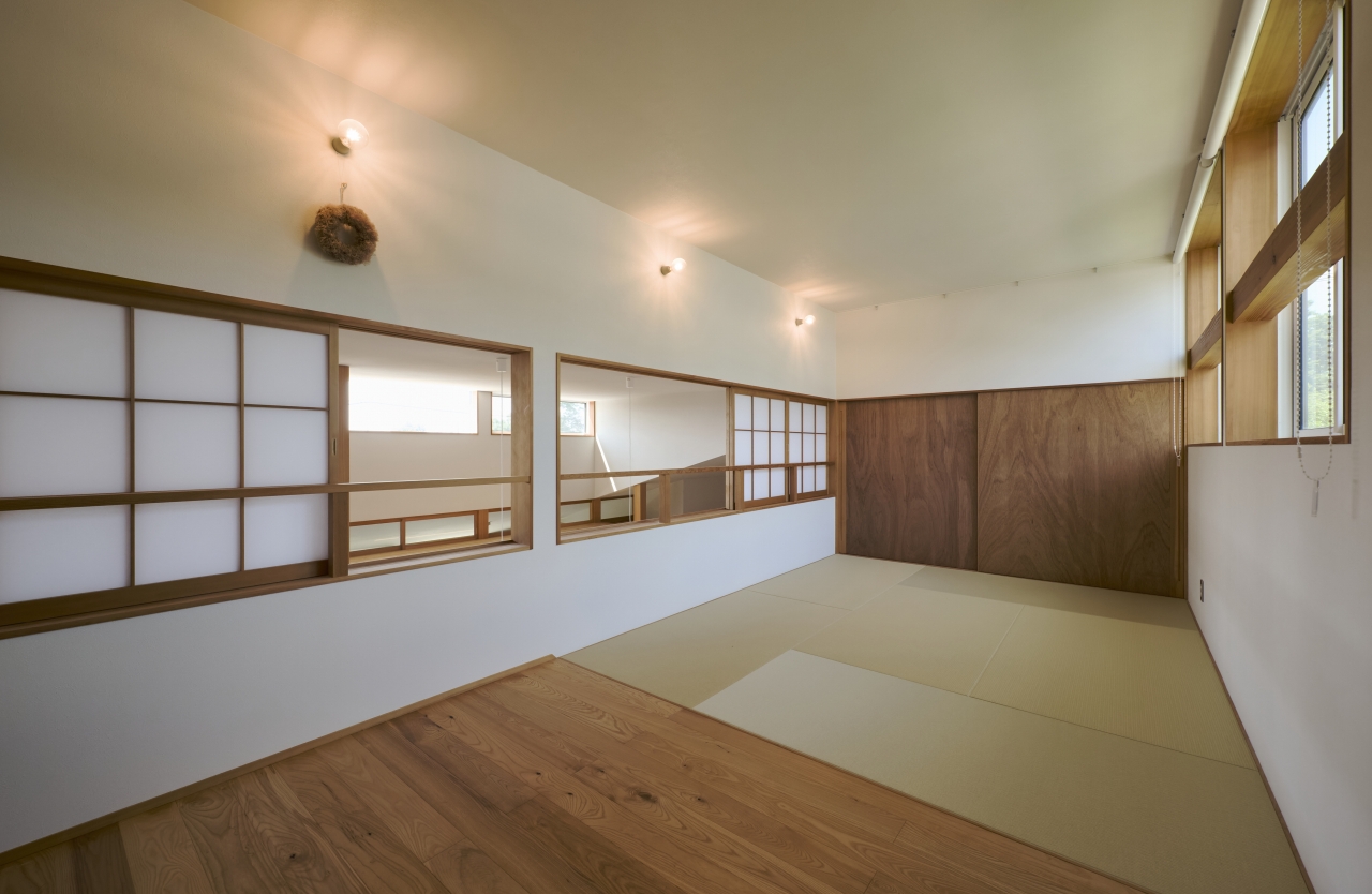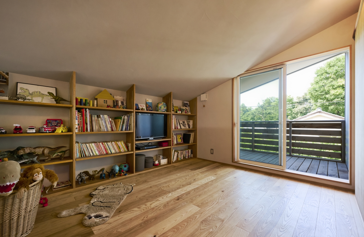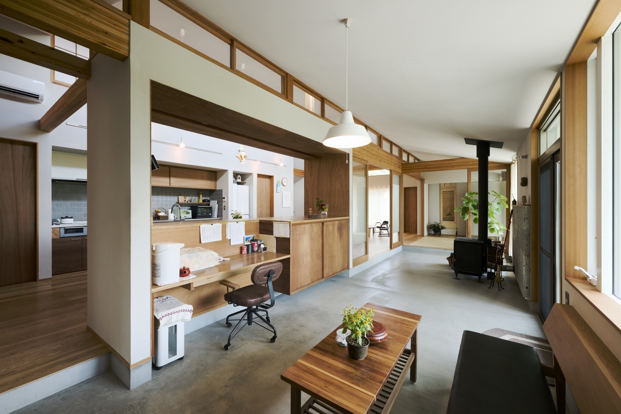 家族をつなぎ、地域をつなぐというテーマを体現するもう一つの存在が、薪ストーブだ。小さなころから薪を使う生活をしてきたN家のごご主人が「薪ストーブのある暮らしをしたい」と望み、休みの日には自ら薪を割る。設計上では、家族に要望された「仕切りのない間取り」や壁ではなく段差で区切った空間構成ととても相性がよく、暖かさが家中をめぐる。