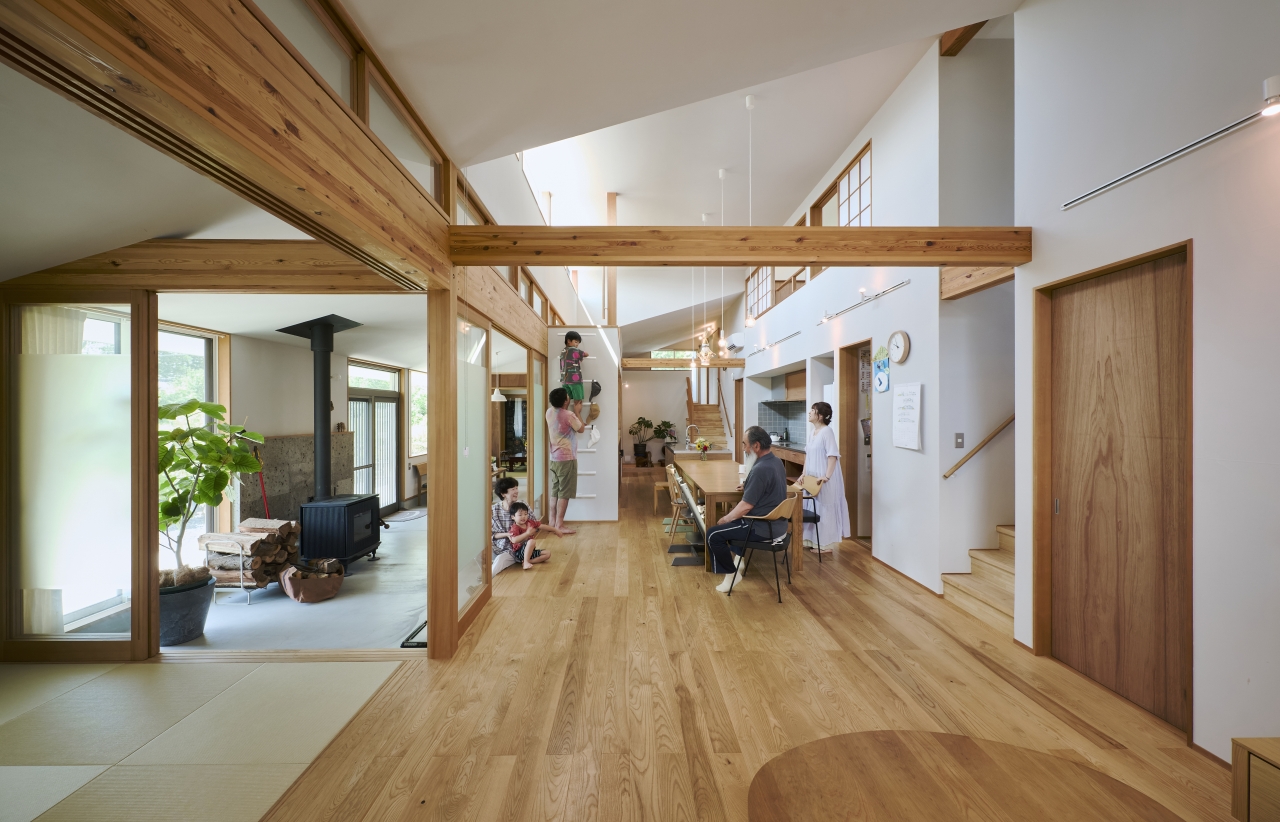大きな一枚屋根の下、外に向かって大きく開くT・N邸。格子の玄関から入ると、薪ストーブのある通り土間が広がる。この半屋外の空間が、二世帯の暮らしとご近所付き合いを包み込むキーポイントだ。