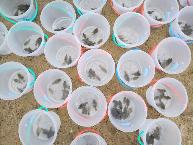 いけすからバケツの中に入れられた稚魚は、