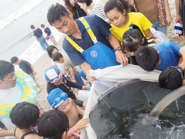 子どもたちの手により、日本海へ放流されました。