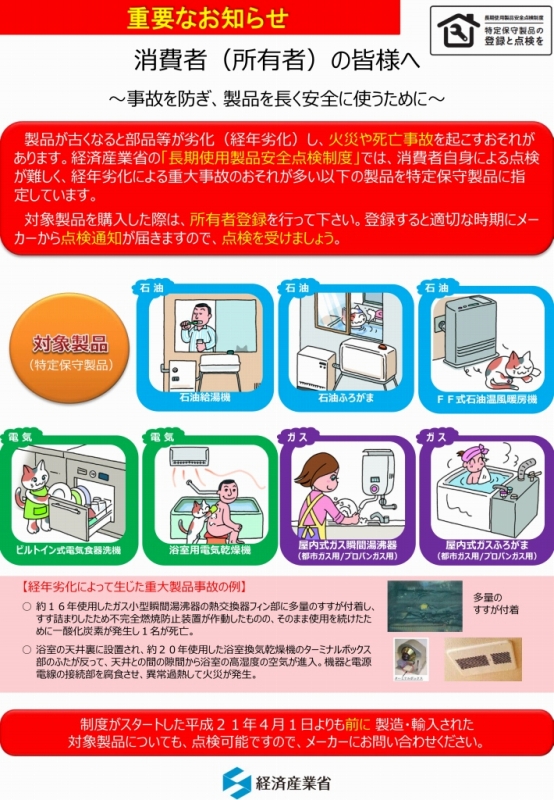 2009年4月1日に施行された「長期使用製品安全点検制度」に基づき、製造から10年を経過する「特定保守製品」をご購入いただいたお客様に各メーカーから点検の通知ハガキが届きはじめていると思います。