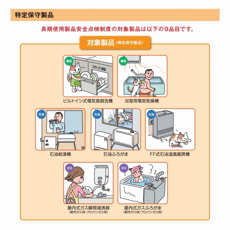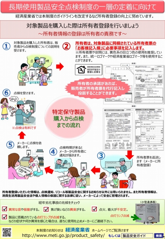 ▶長期使用製品安全点検経度のリーフレット(経済産業省発行)ダウンロードはこちらから(PDF:1MB)