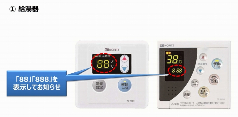 “点検お知らせ機能”を搭載している機種もあり、例えば給湯器の場合、リモコンに「88」もしくは「888」の表示でお知らせします。