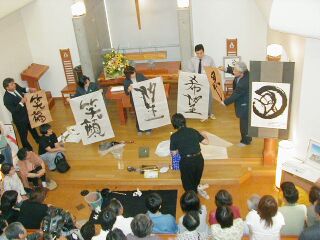 後半はパフォーマンスとして、先生より実際に筆で文字を書いて頂きましたが、墨の濃淡や、先生の描く一筆の迫力で「希望」・「望」・「笑顔」と次々と紙に現れてくるその文字はとても表情豊かで、来場された方々は「書のもつ魅力」を感じることができたのではないかと思います。