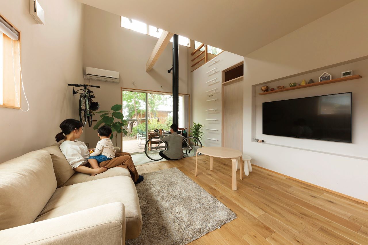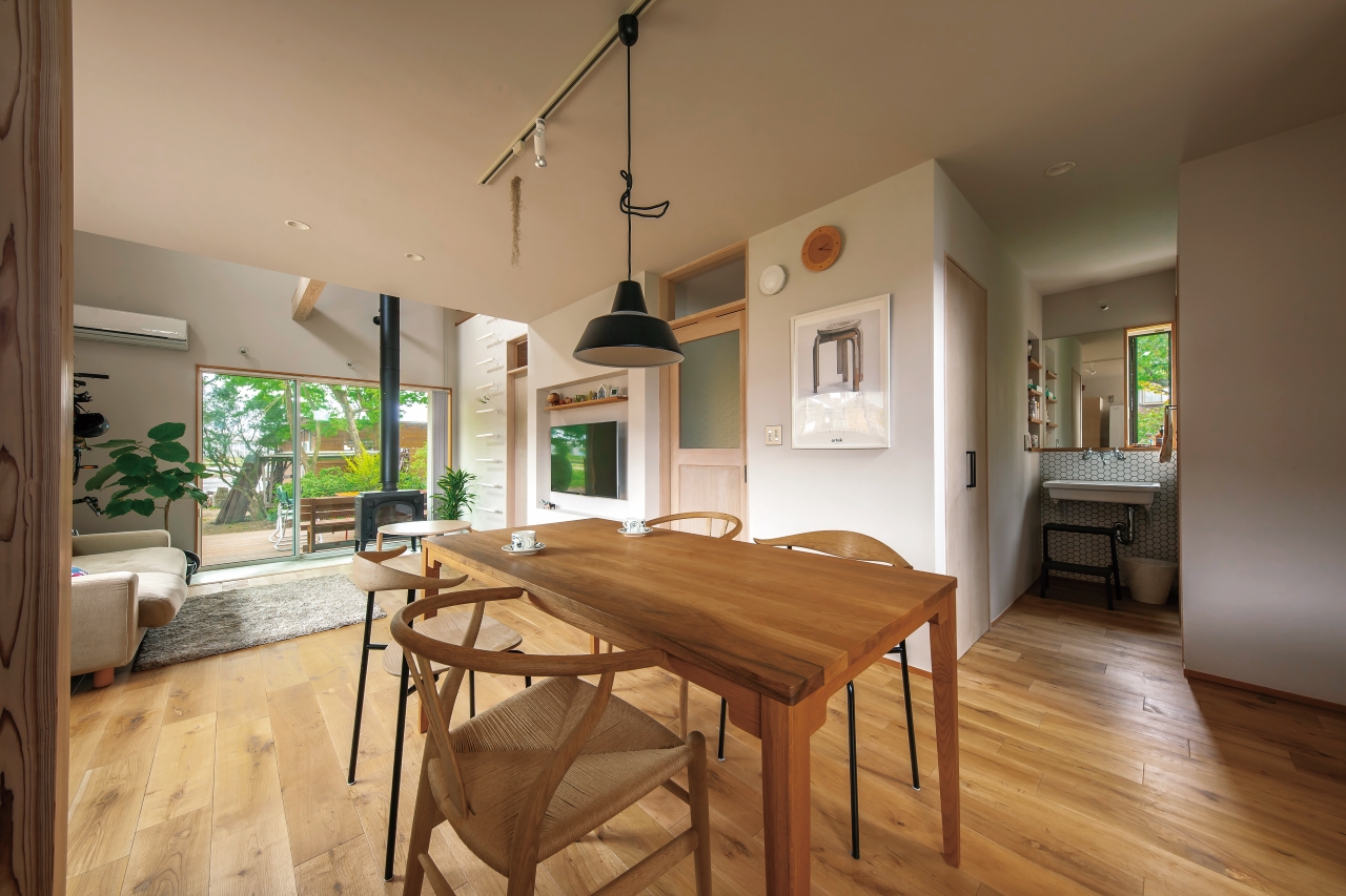 薪ストーブがある土間を南側に配置し、そこから外のウッドデッキへと出られるようにしています。