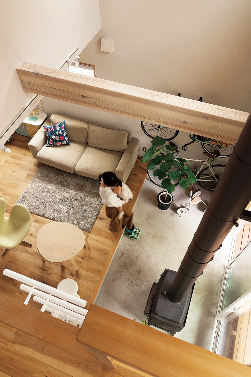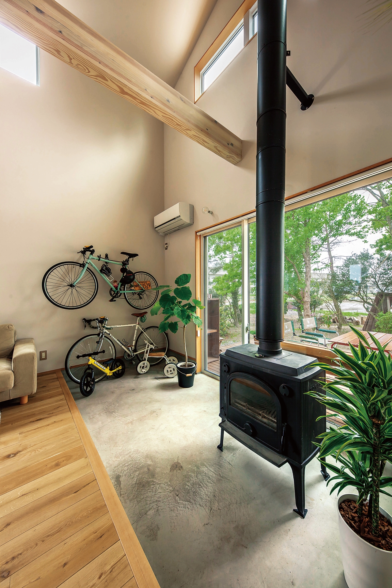 ご主人様:趣味の自転車が置ける土間と薪ストーブ。