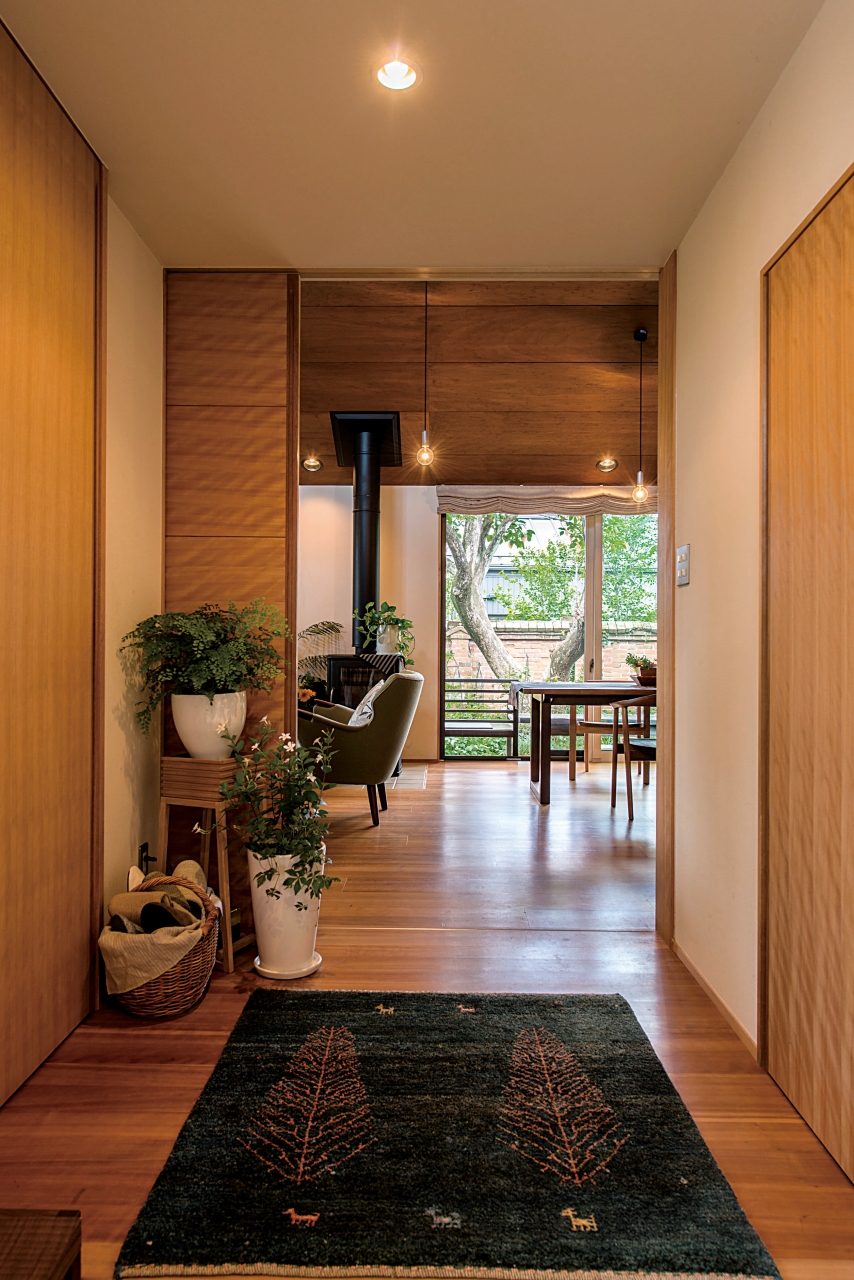 煉瓦塀と柿の木を眺めながらの暮らしを希望しました。塀に向かって北向きに開いたLDKからは、どこに居ても褐色の煉瓦塀と柿の木が視界に入ります。設計者の提案してくれたプランと私たちが思い描いたライフスタイルが一致していたのは幸福でした。