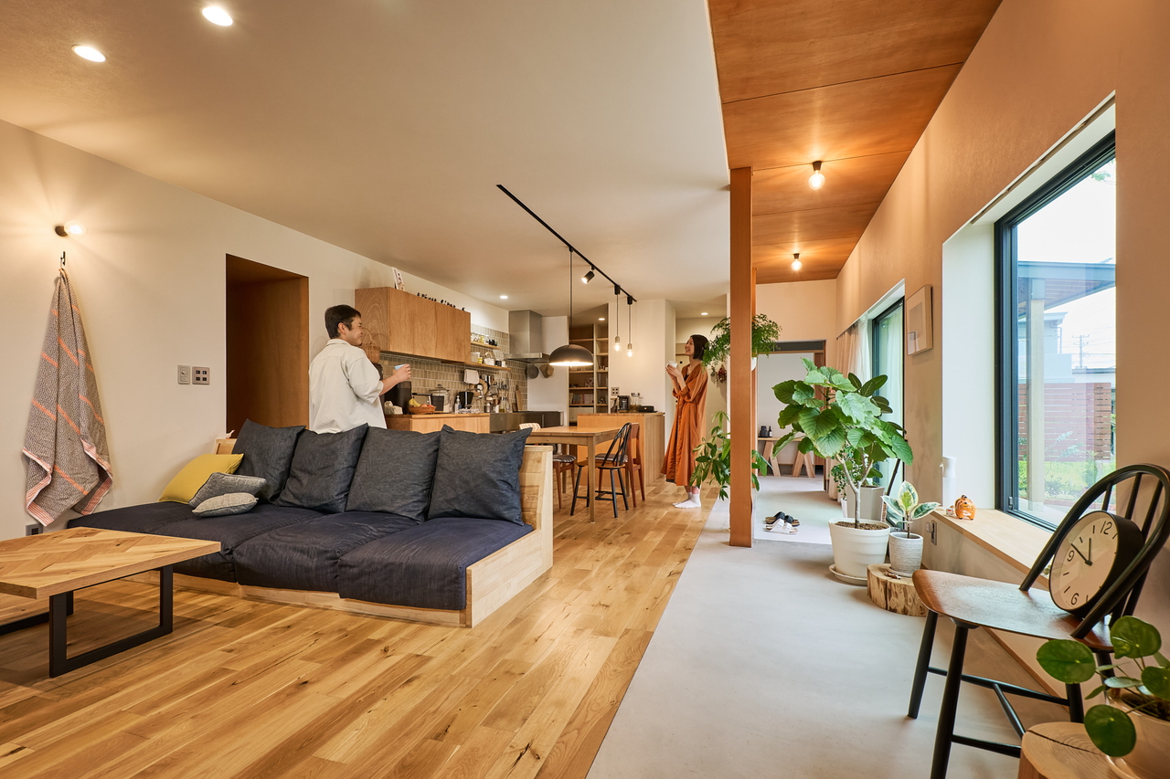 窓の外には、芝生の緑、赤と緑の葉が美しい木々。室内には、ウチ土間が走る大きなひとつながりの空間。床は、あえて節のあるオークを選び、土間の天井や収納扉はラワンの素材感をそのまま生かすなど、ラフな質感とマットな色が溶け合う。「ちょっと不便でも、広々と暮らしたかった」。新築を考えていたK夫妻は、環境を優先させ、中古住宅を全面改修した。