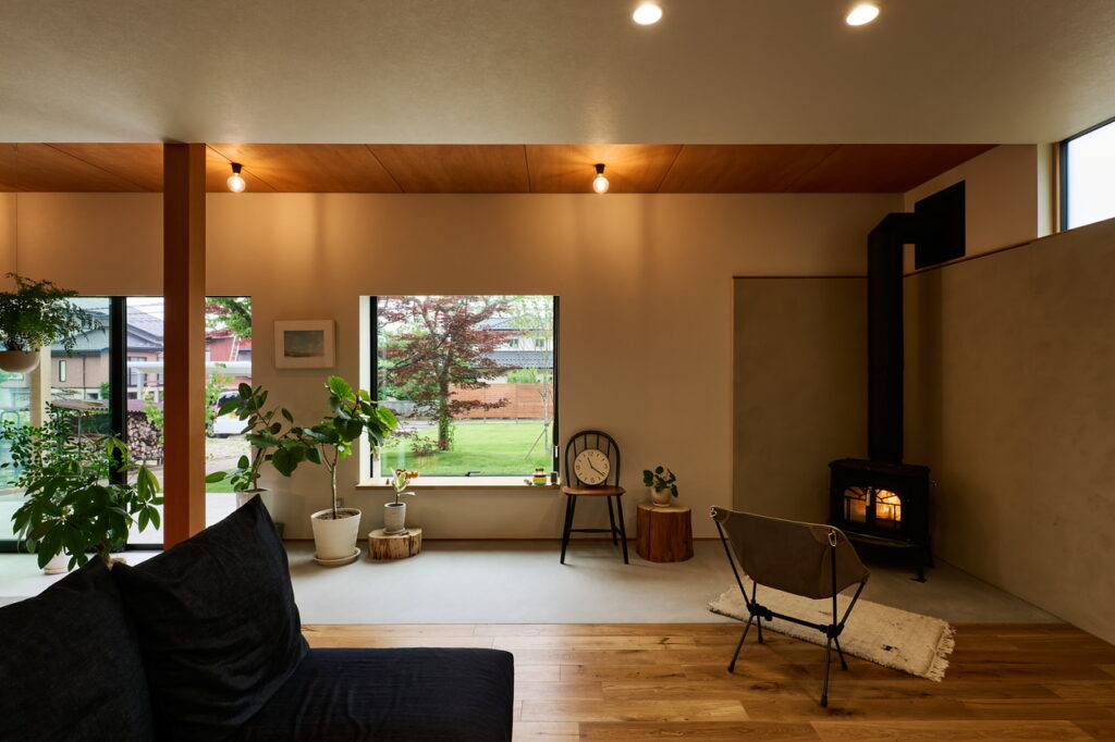 ウチ土間は、もともと縁側だったところを造り替え、窓を開ければ、ソト土間ともつながるように設計された。担当者の提案により、ウチ土間の一部を下げたことで「部屋の角に置きたいと思っていた薪ストーブの納まりもよくなった」とKさん。段差のある土間とLDK、床と天井の素材に変化をつけた結果、雰囲気や暮らしの場面も自然と分けられ、表情にも奥行きが生まれている。