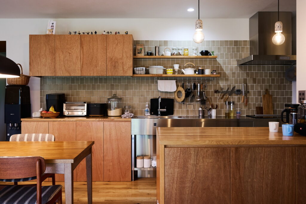 リビングダイニングとつながるオープンキッチンは、カウンターや収納棚などすべて造作。収納扉はラワンの素材感をそのまま生かし、壁のタイルは質感のあるグレージュに。「マットな色や素材感が好き」という奥さまの好みでまとめられている。