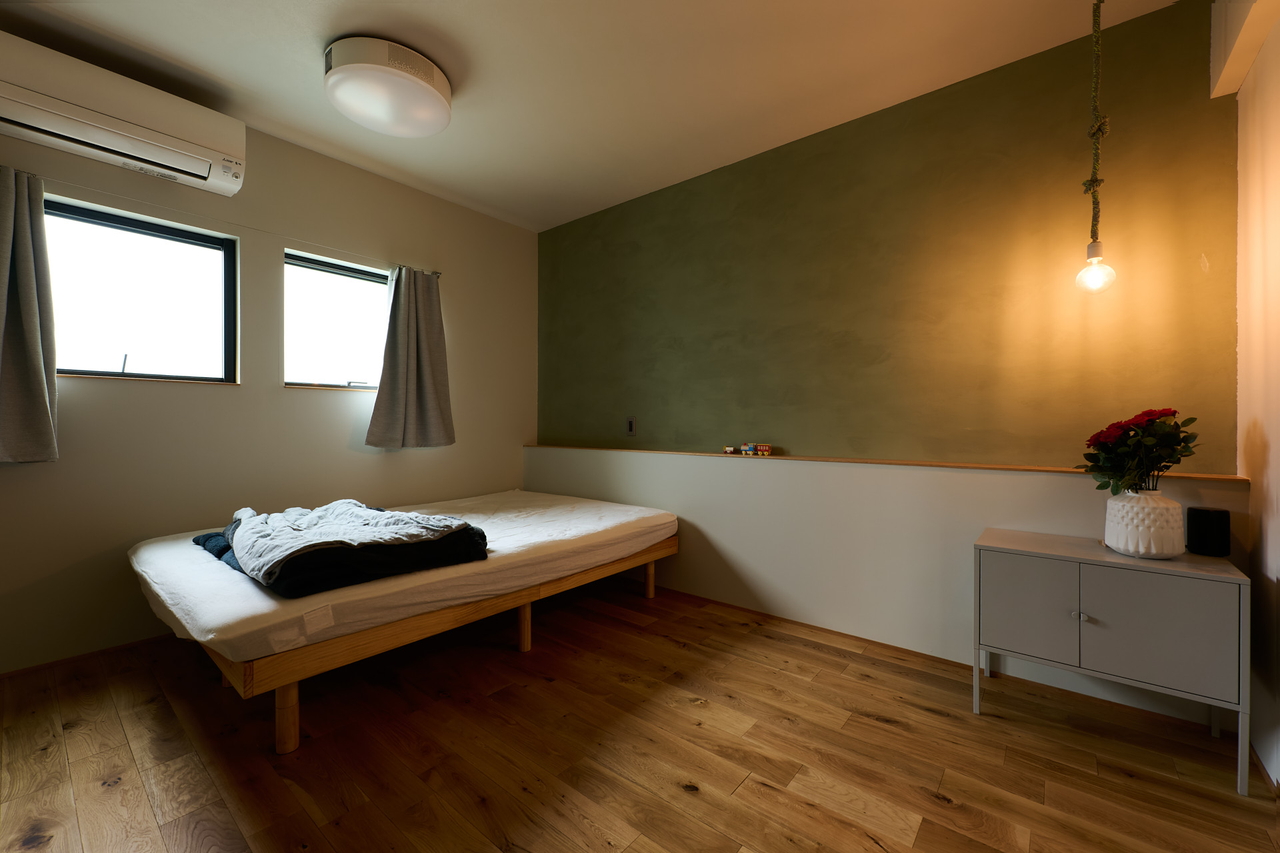 TV裏や寝室の塗り壁は、夫婦2人のDIYで仕上げた思い出の場所。「どうしてもキレイに塗りたくなる」というご主人に、「ムラをつけてほしい」とリクエストし、こちらも、手触りのあるテクスチャーに仕上がった。