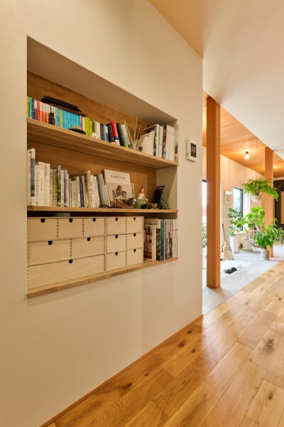 LDKには、開放的なひとつながりの空間を、区切りながら使う工夫も光る。たとえば、玄関との間を仕切る壁は、裏側が収納棚に。外からは見えない場所を有効に活用しつつ、暮らしやすさも支えている。