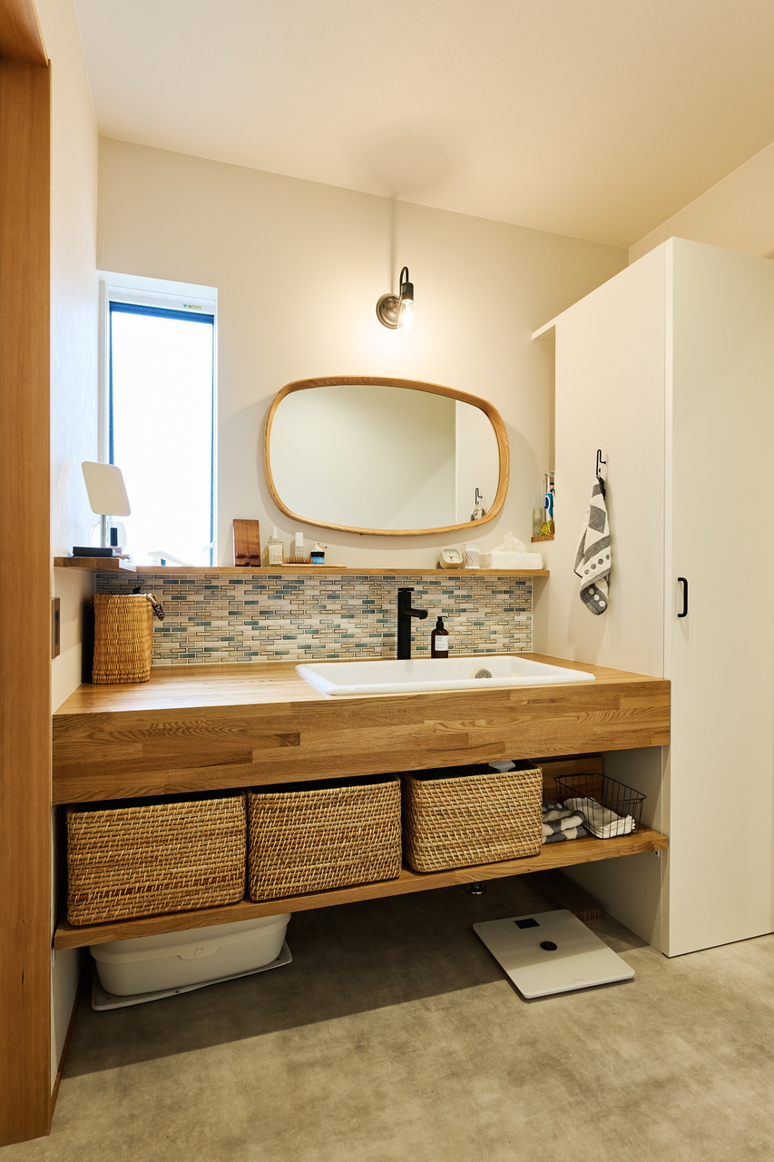 暮らしやすさといえば、なんといっても水回りの配置だろう。キッチンの裏側に、造作した洗面台をはじめ、脱衣室、サンルームがコンパクトにまとめられ、家事動線はとてもスムーズだ。