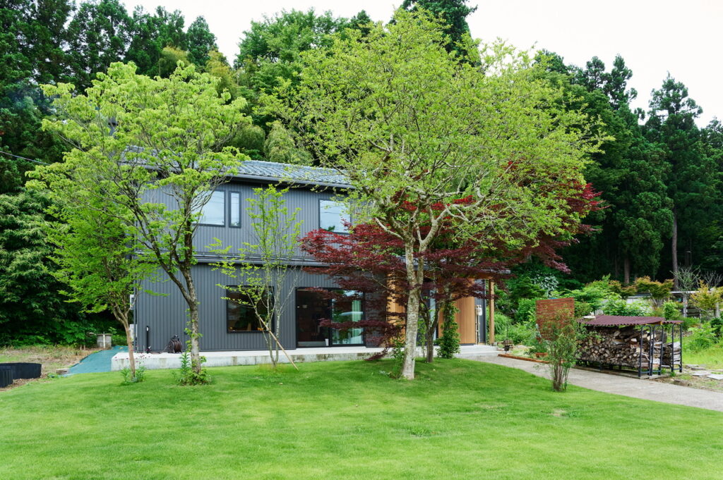 引っ越して2年。草を刈り、木を増やし、芝を張った庭は、グレーの外壁を背景に、日に日に色濃く緑が映えるようになった。「どこにいても、ゆったりと過ごせるのがいい」とご主人。奥さまは、好きなものに囲まれて暮らす時間が「しあわせ」と言った。