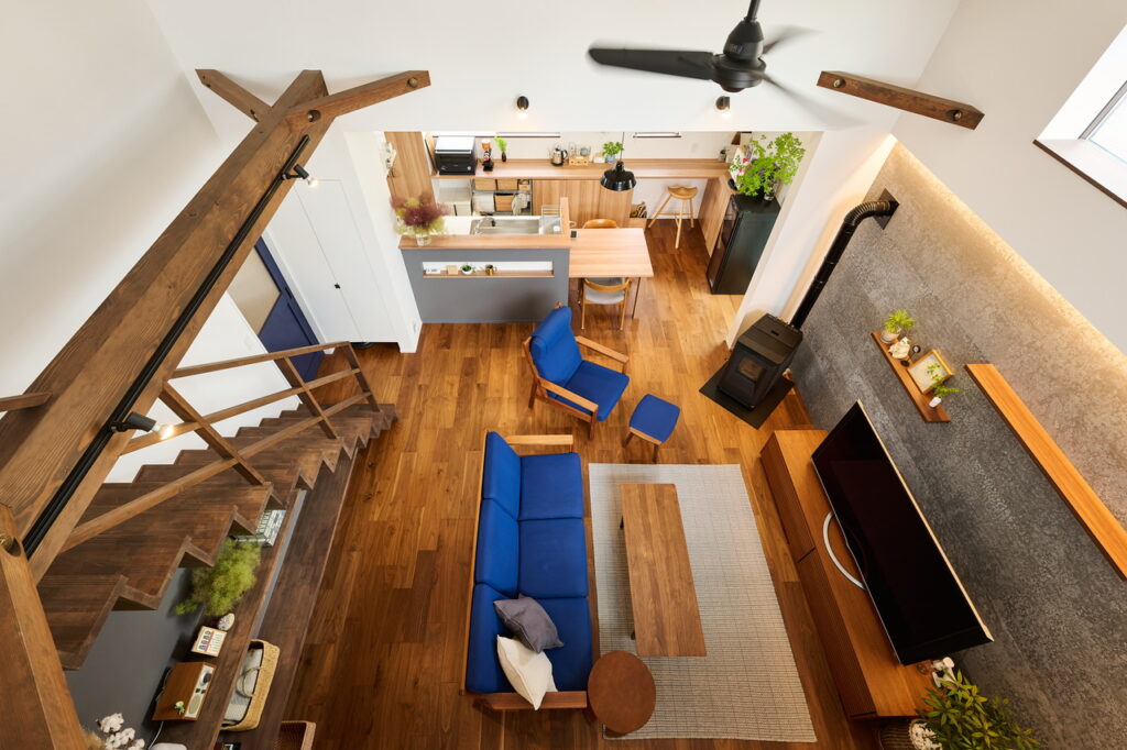 1年以上かけて約30軒の見学会に足を運んだS夫妻は、訪れる家が毎回、まったく違うことに驚き、感動したという。「宝探しのようでした」。次第に、自分たちの家のイメージが固まっていった。明るいLDKと家事のしやすい動線。二人暮らしゆえに「部屋数はいらないから、ワンフロアで生活を完結させたい」。こうして、吹き抜けのリビングが2階とつながる住まいが生まれた。