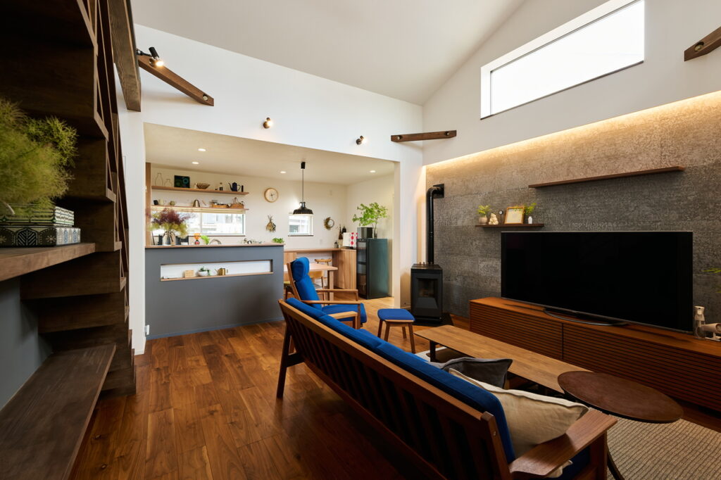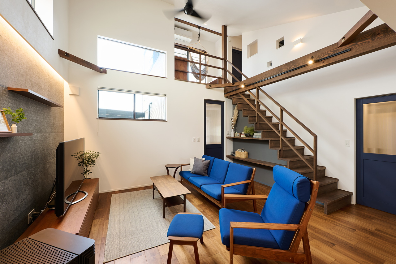 吹き抜けのあるLDKには、高窓から、キッチンの窓から、陽光が差し込み、隅々まで明るく心地よい。ブルーとホワイトと木。北欧テイストの色合いと素材が、TV裏に張ったセメント板「SOLIDO」によって、きりりと引き締められている。