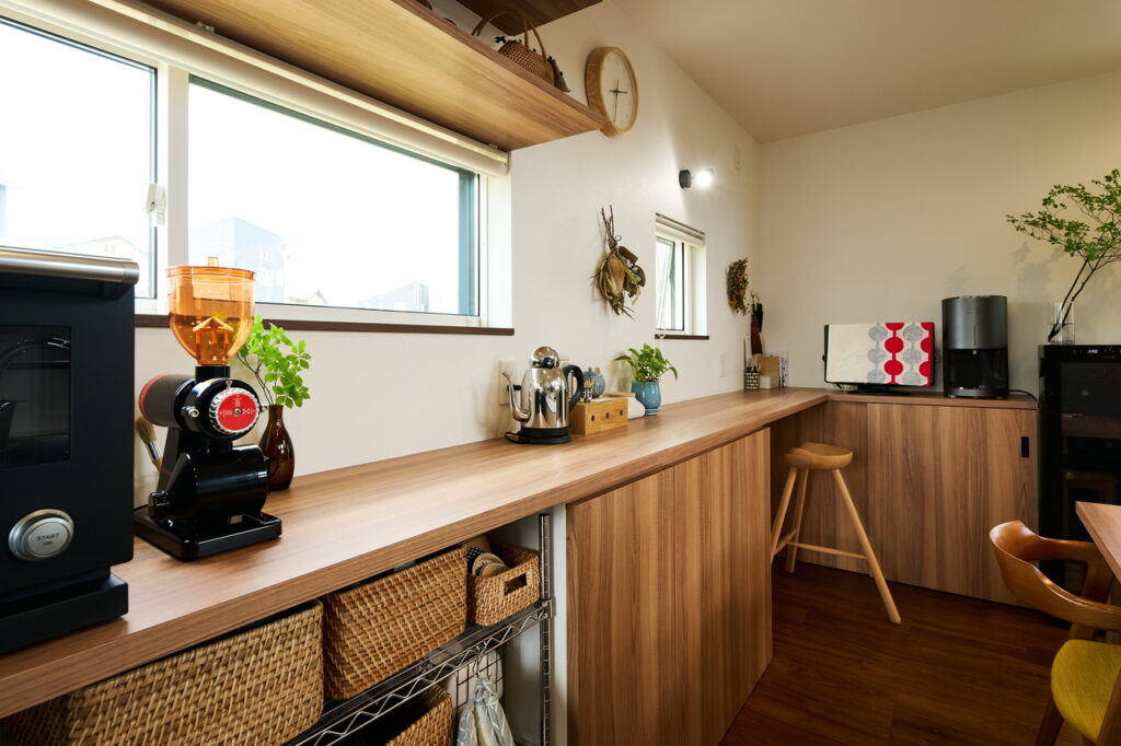 キッチンカウンターの裏には、壁に沿ってL字型の収納棚を配置。市販の収納ボックスや棚を納め、器は引き出しに収納できるよう、オーダーメイドで依頼した。「もう、モノは増やさない」と決めた奥さま。厳選したモノたちは、余白を生かし「飾るように」置かれている。