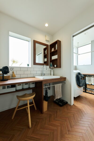 家事動線も、とっても理想的。キッチンの奥には、広々とした洗面台やランドリールームが集められ、料理をしながら洗濯など、家事が並行できる。洗面ボウルを組み込んだカウンターも造作。収納ボックスの置き場所やタオルバーを付け、すっきりと機能的に仕上げている。