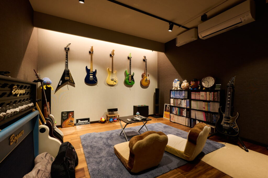 ご主人はギター、奥さまはボーカル。バンドを掛け持ちしている二人が、演奏や練習に没頭できる防音のスタジオ兼シアタールーム。スクリーンを下ろせば、シアタールームに。