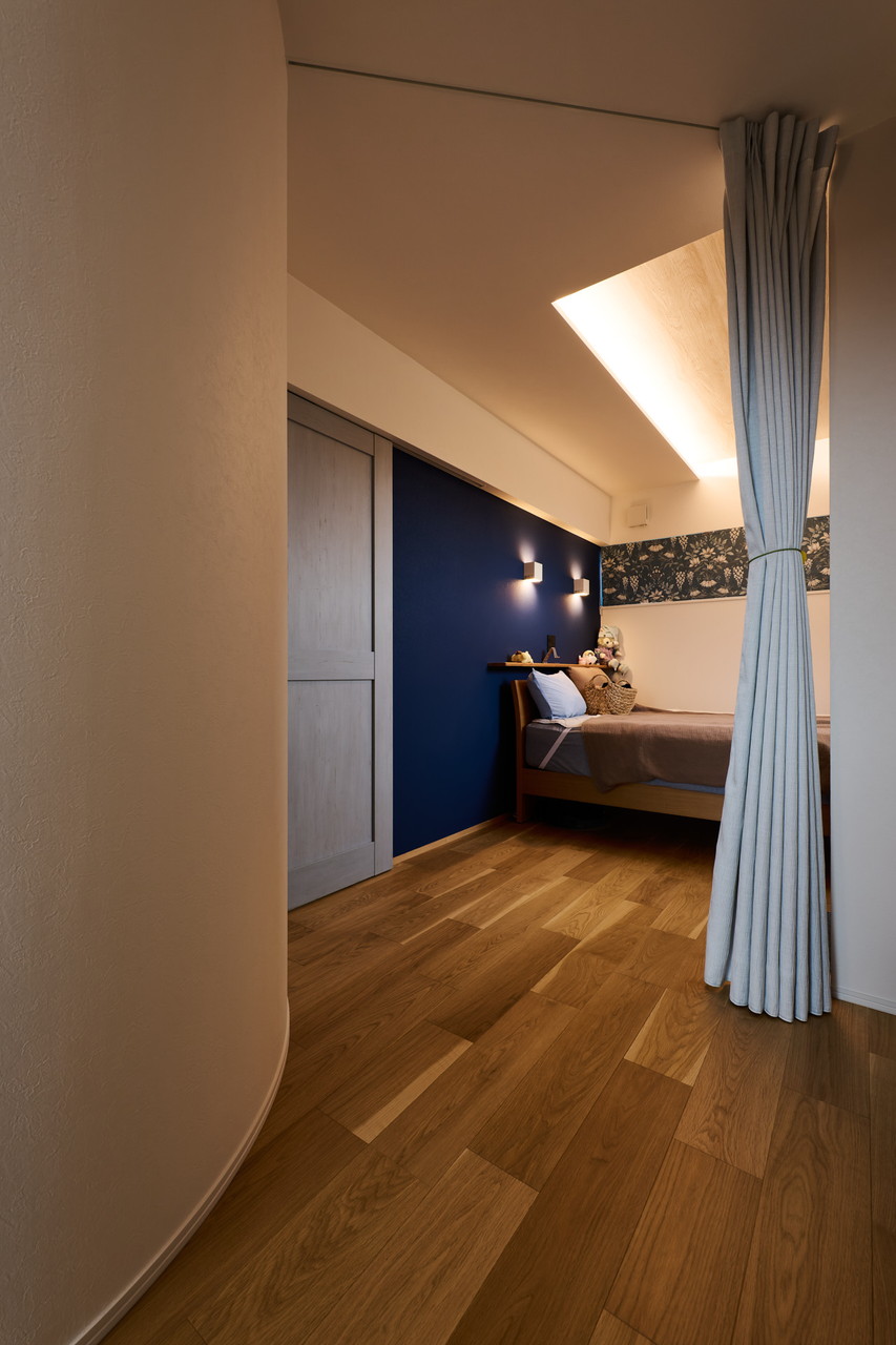 ヌックの壁に沿って行くと、寝室がある。「2人暮らしなので、仕切らなくていい」という要望を受け、カーテンで簡単に開け閉めできるようにした。