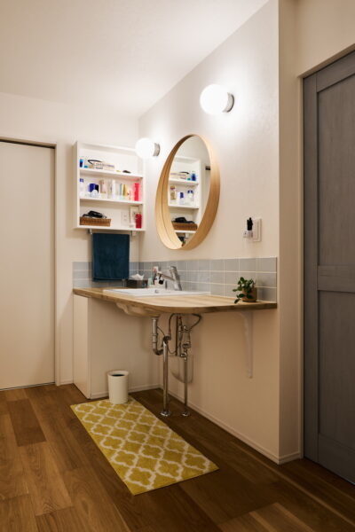 LDKの延長にある洗面スペースは、オリジナルで製作。板に洗面ボウルを嵌め込み、壁には円形の鏡を付けて。