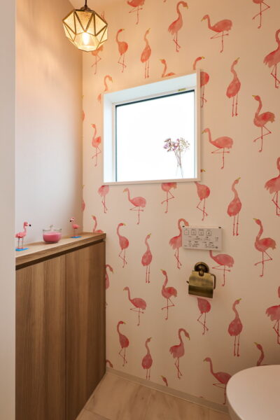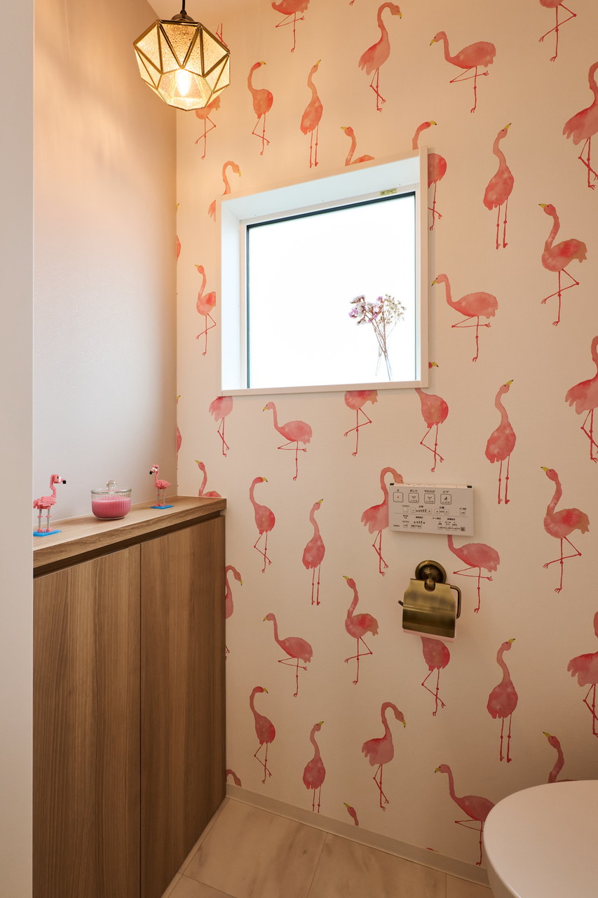 「見えないところはあえて派手に」と選んだクロス。H邸では合計10種類以上を採用し、トイレはピンクのフラミンゴに。