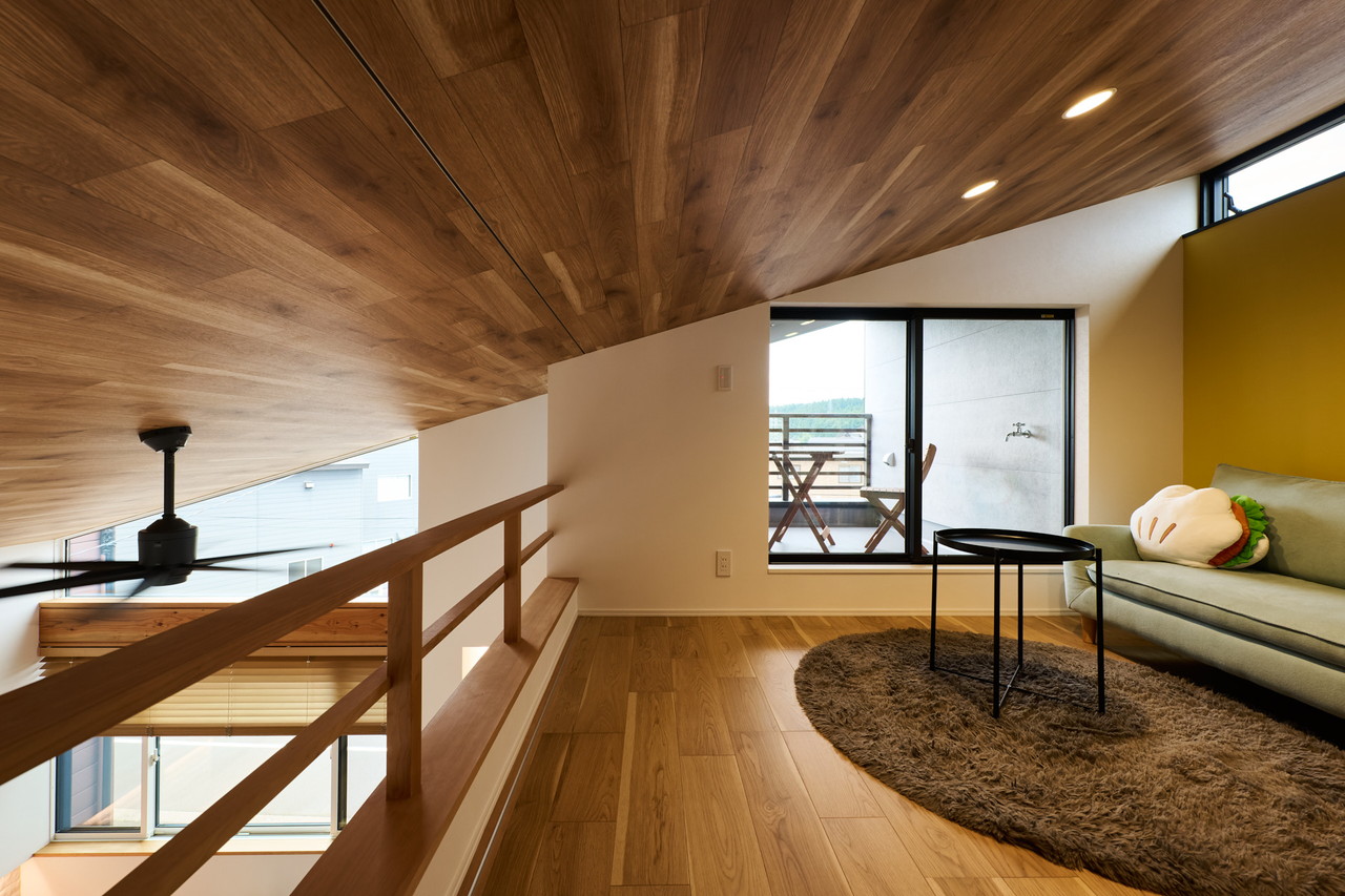 ロフトの先には、「片貝まつりの花火が見たい」と設けたベランダ。時に、好きな紅茶とお菓子でティータイム。勾配天井のロフトは、吹き抜けでリビングとつながりつつ、戸を閉めれば、もう一つの籠り空間になる。