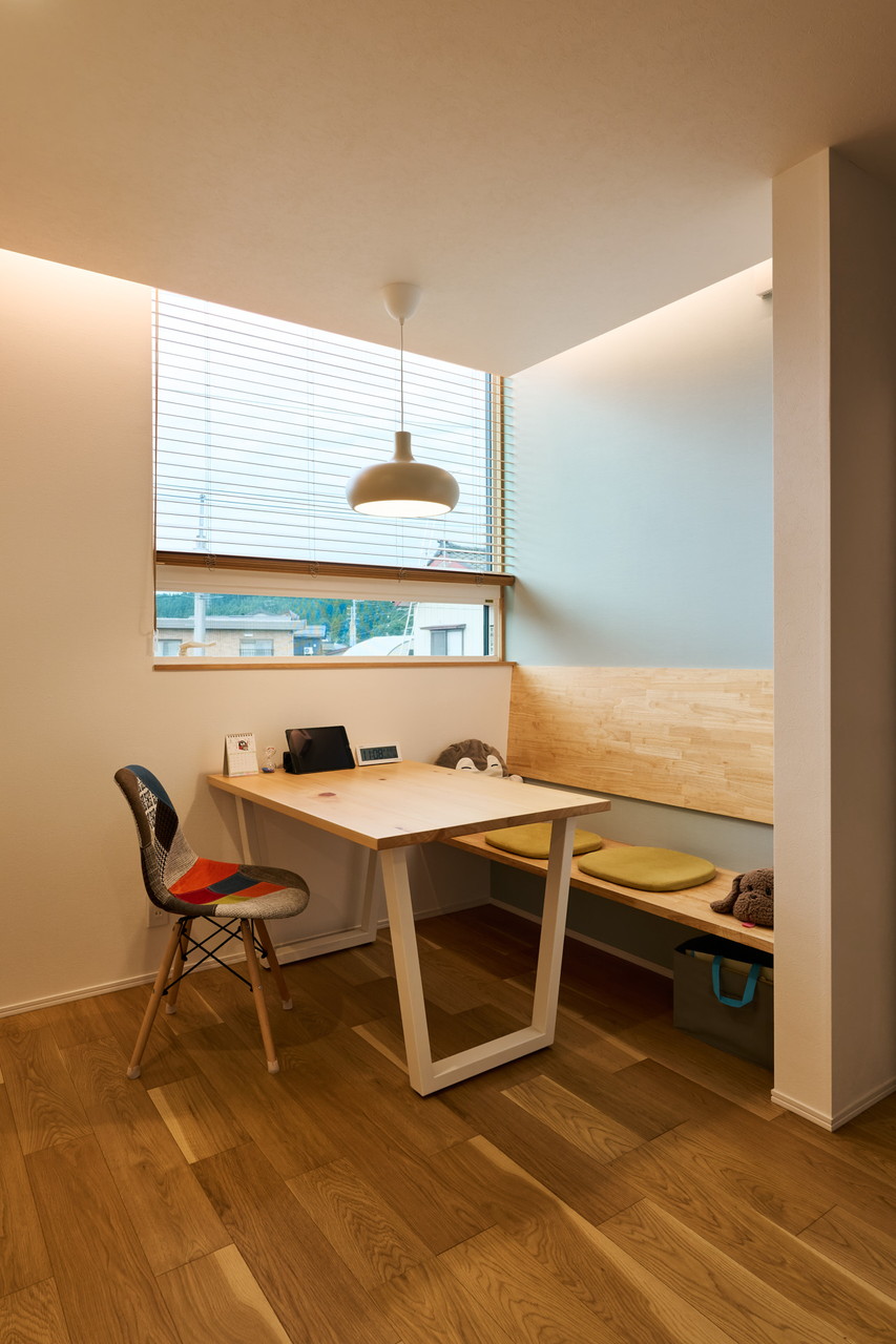 ダイニングスペースは、部屋のコーナーを使って、パステルカラーで清々しく。壁際にはベンチを造作して、スペースを有効活用している。