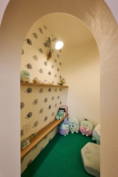 丸いヌックの壁にはハリネズミのクロス。「すみっこぐらし」のキャラクターを隣に読書する時間は、「家族と同じ部屋にいながら、集中できる」貴重なひとときだ。