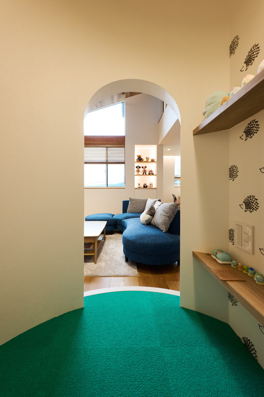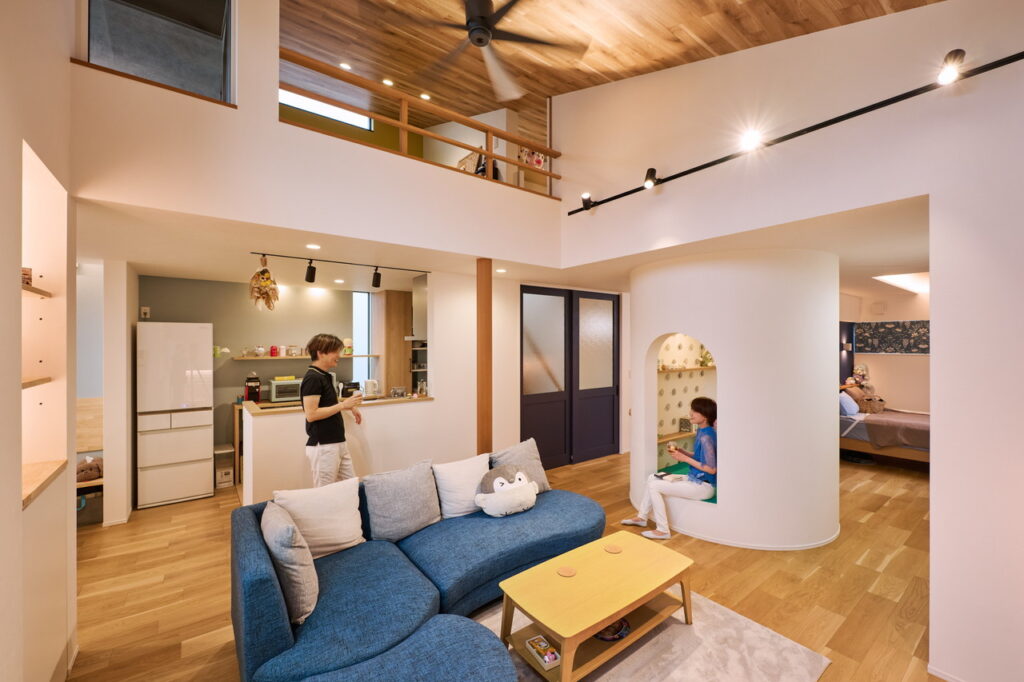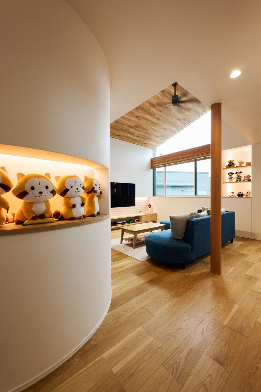 LDKに入ると、ラスカルが並んで迎えてくれる。飾られた丸い柱は、中に入れるヌックになっているという意外性。「ちょっと遊んでみました」。設計者からの提案は、特に奥さまが喜んだ。「籠れる場所と飾る場所が一つになって、しかも丸いのがよかった」。丸さは、部屋にやわらかさも生んでいる。